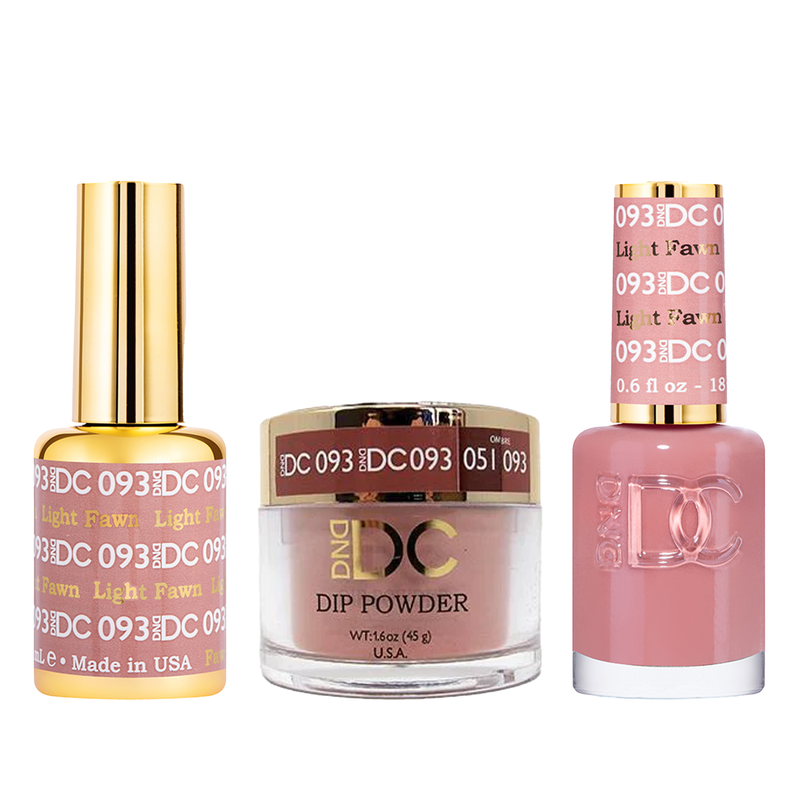 DND DC Trio 093 Light Fawn includes a gel polish, a matching lacquer and powder. The set provides a complete solution for a professional manicure with a long-lasting and beautiful color.