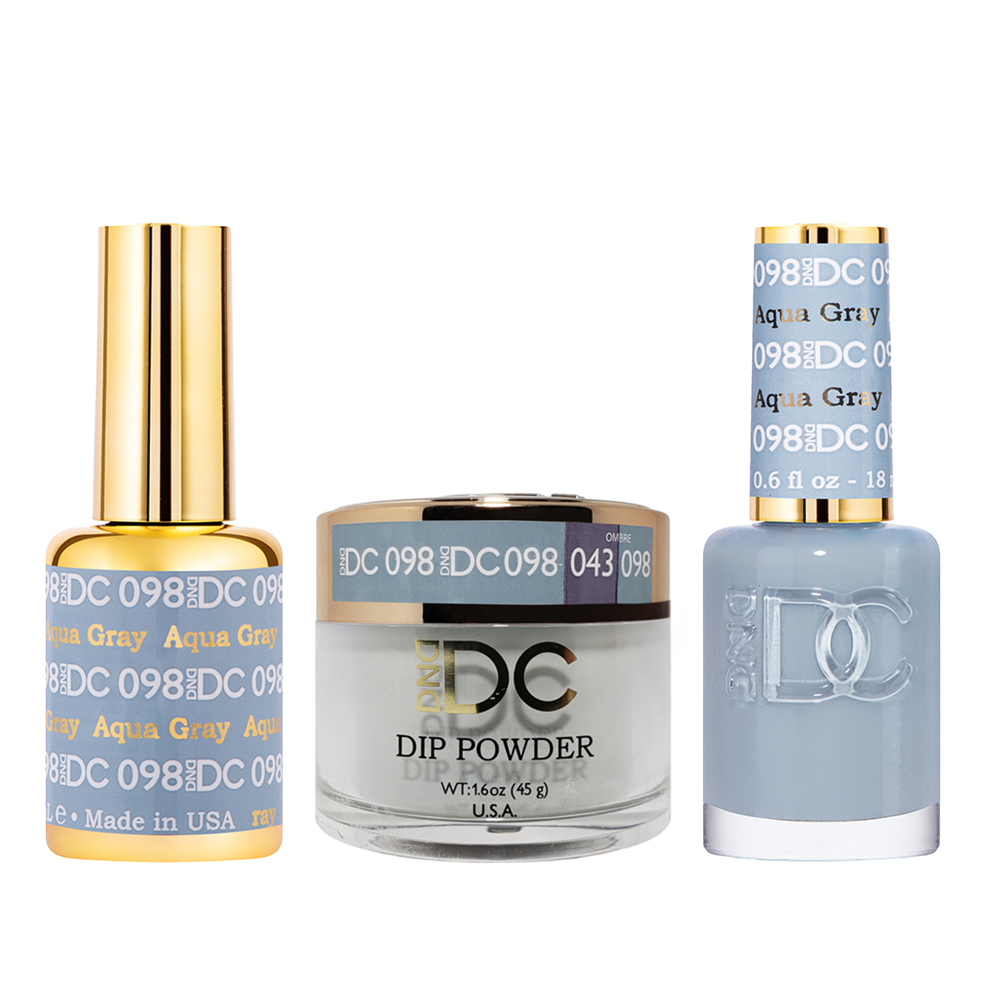 DND DC Trio 098 Aqua Gray includes a gel polish, a matching lacquer and powder. The set provides a complete solution for a professional manicure with a long-lasting and beautiful color.