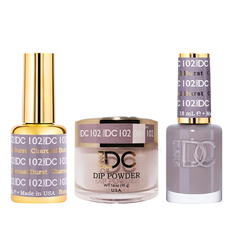 DND DC Trio 102 Charcoal Burst includes a gel polish, a matching lacquer and powder. The set provides a complete solution for a professional manicure with a long-lasting and beautiful color.