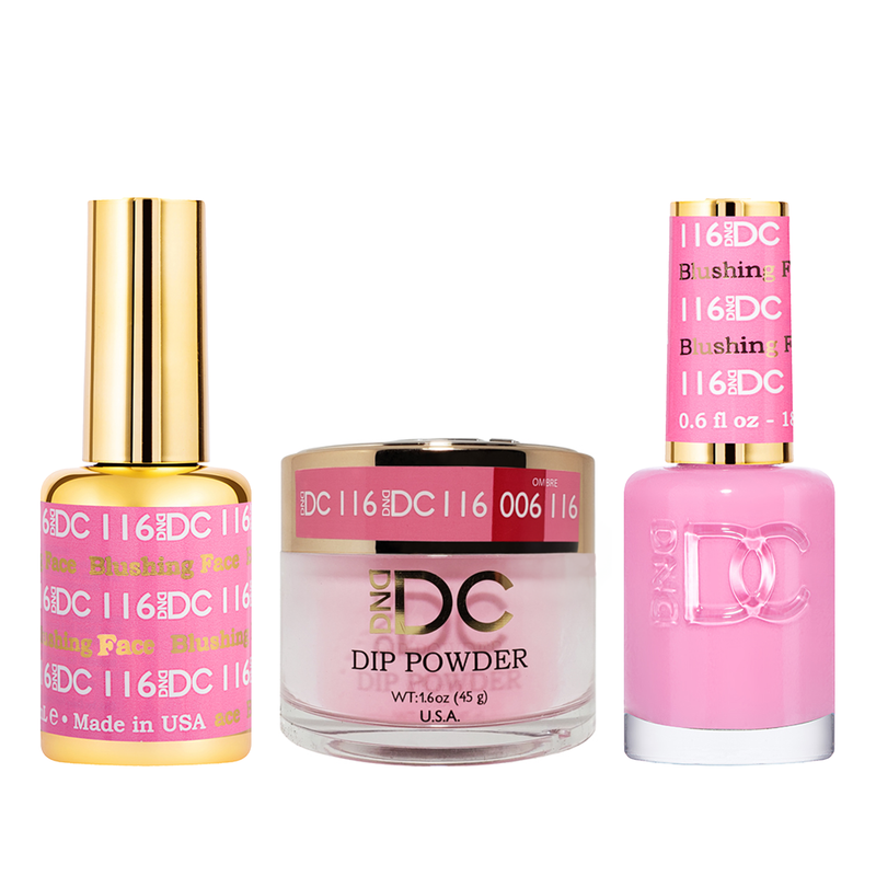 DND DC Trio 116 Blushing Face includes a gel polish, a matching lacquer and powder. The set provides a complete solution for a professional manicure with a long-lasting and beautiful color.