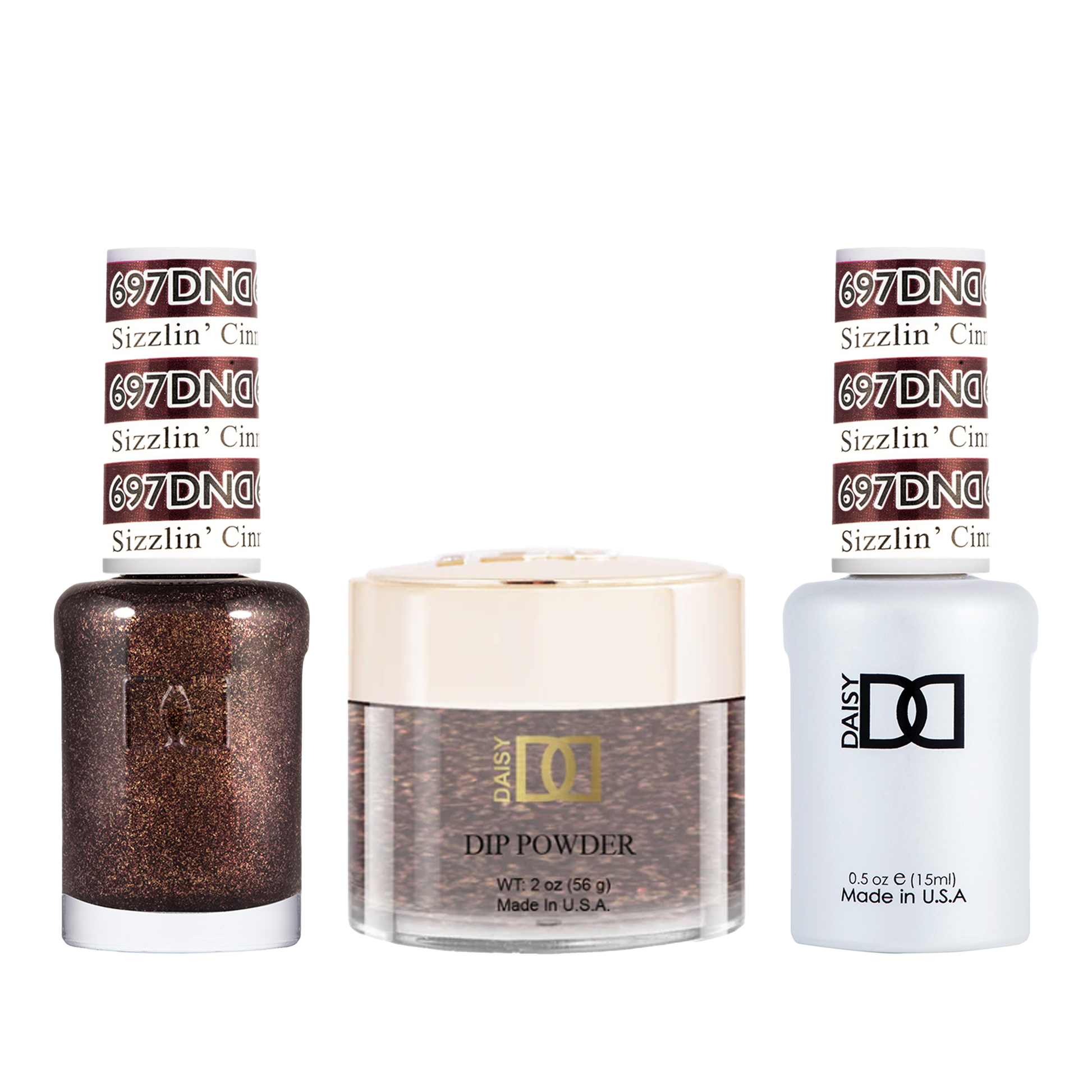 697 Sizzlin Cinnamon includes a gel polish, a matching lacquer, and a dip powder. The set provides a complete solution for a professional manicure with a long-lasting and beautiful color.
