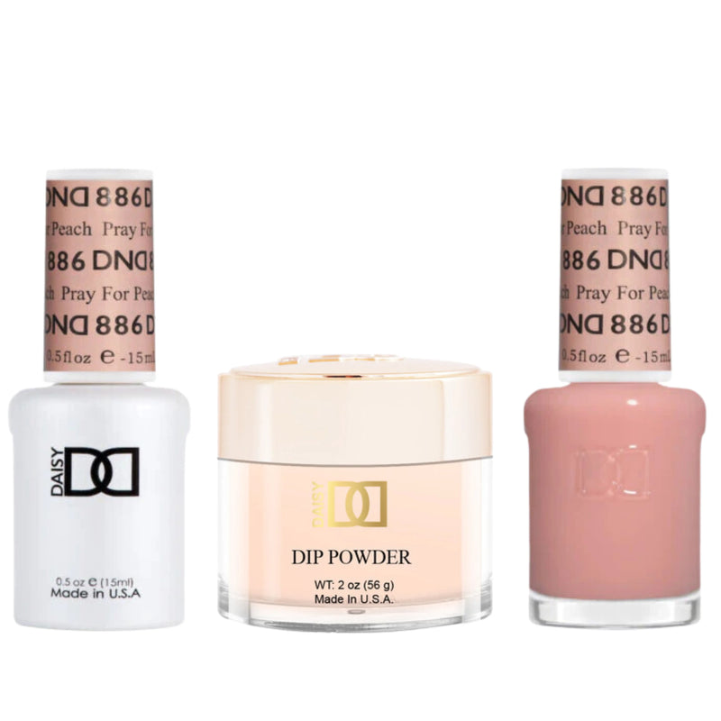 Seeking perfect nails? DND Trio - 886 Pray For Peach is your answer! This set includes Nail lacquer, gel polish, and dip powder in a beautiful color that will last you a long time. Achieve flawless and long-lasting nails with ease. Try now!