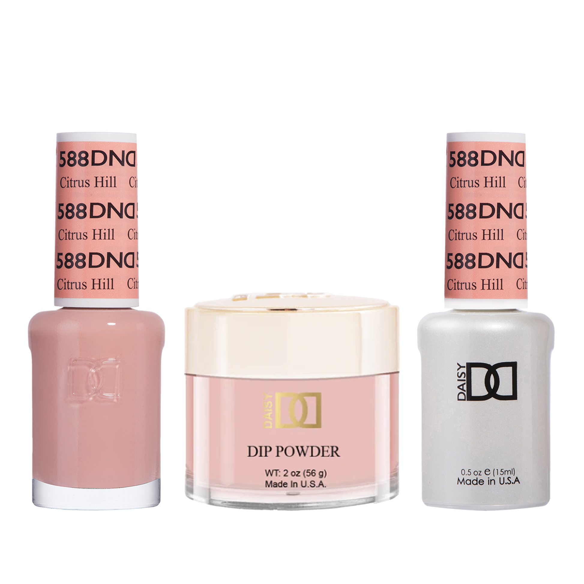 DND Trio - 588 Citrus Hill includes a gel polish, a matching lacquer, and a dip powder. The set provides a comprehensive solution for a professional manicure with a long-lasting and delicate pink color. The gel and lacquer work together for a glossy finish, while the dip powder adds strength and durability to the manicure.