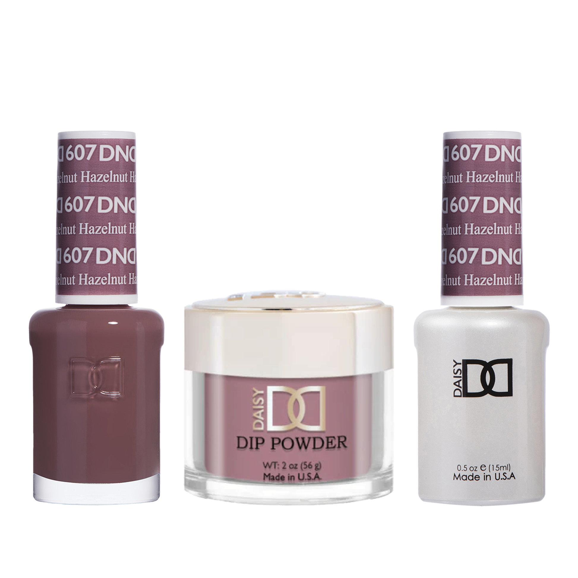 DND Trio - 607 Hazelnut includes a gel polish, a matching lacquer, and a dip powder. The set provides a complete solution for a professional manicure with a long-lasting and mauve color.
