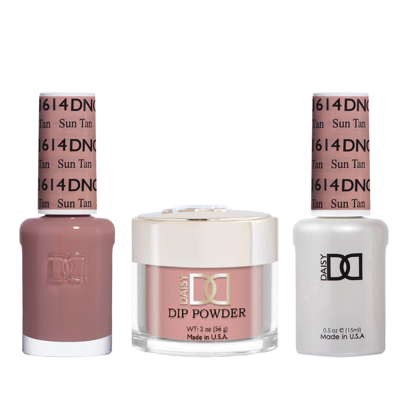 DND Trio - 614 Sun Tan includes a gel polish, a matching lacquer, and a dip powder. The set provides a complete solution for a professional manicure with a long-lasting and orange nude color.