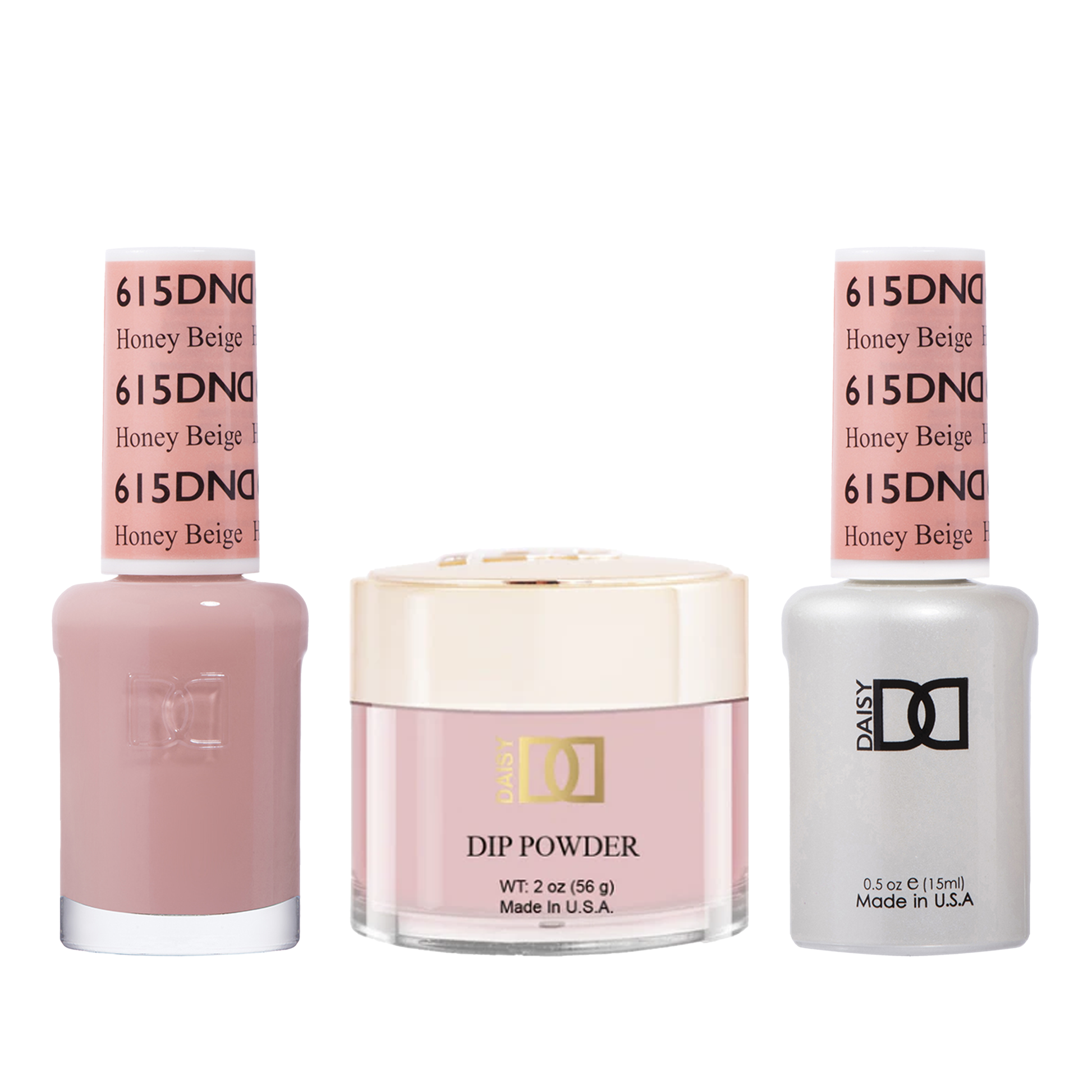DND Trio - 615 Honey Beige includes a gel polish, a matching lacquer, and a dip powder. The set provides a complete solution for a professional manicure with a long-lasting and pink beige color.