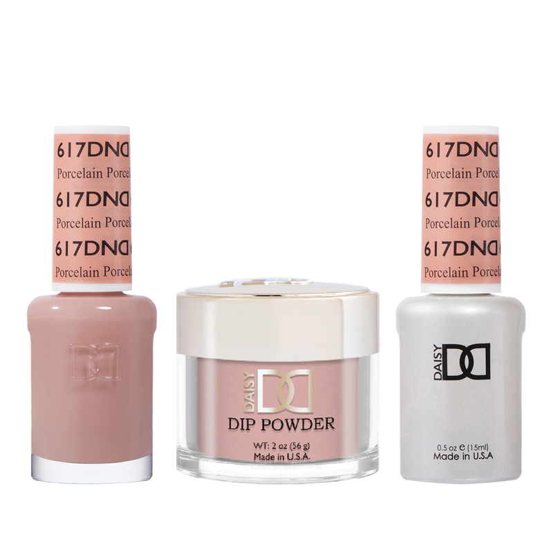 DND Trio - 617 Porcelain - includes a gel polish, a matching lacquer, and a dip powder. The set provides a complete solution for a professional manicure with a long-lasting and orange color.