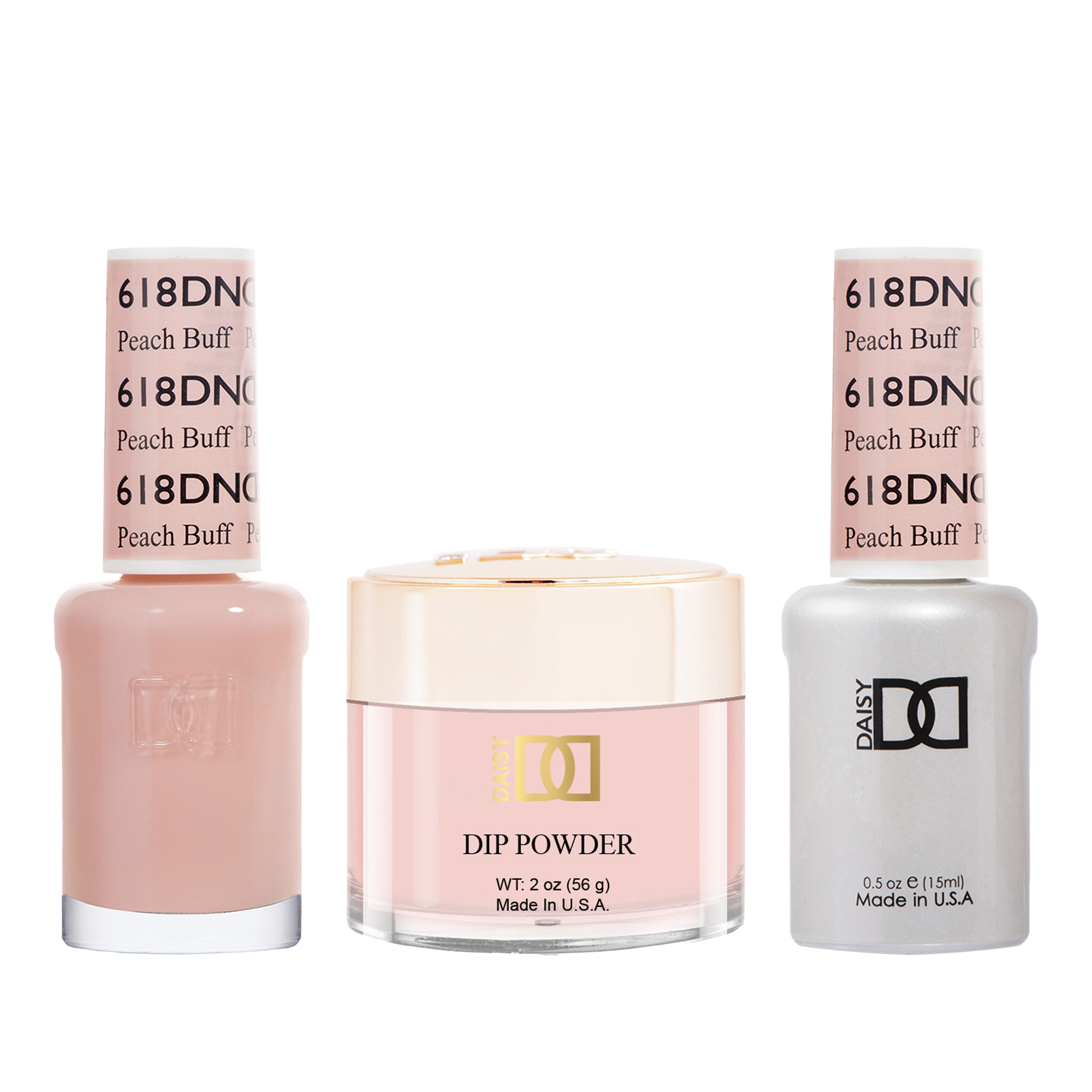 DND Trio - 618 Peach Buff includes a gel polish, a matching lacquer, and a dip powder. The set provides a complete solution for a professional manicure with a long-lasting and pink color.