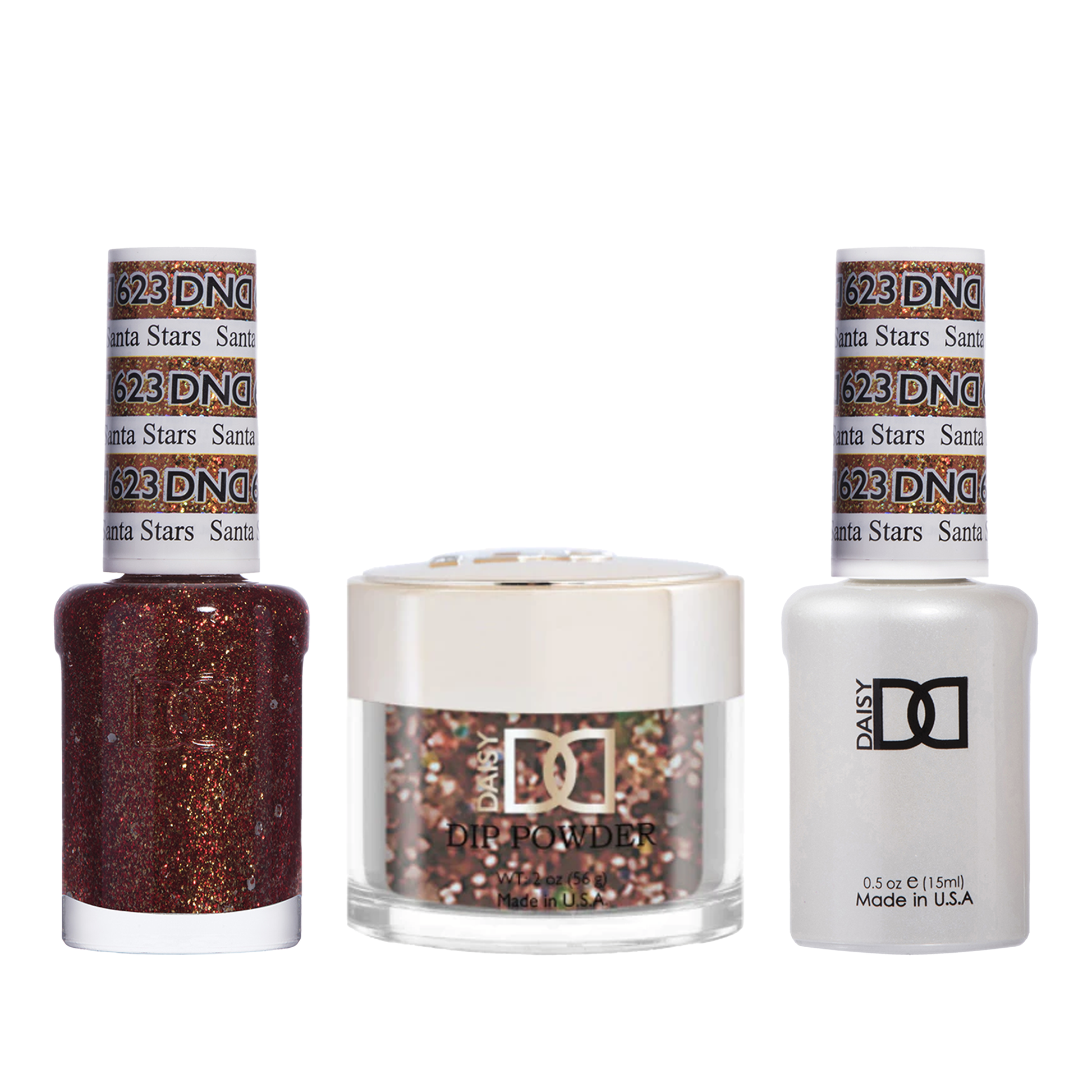 DND Trio - 623 Santa Stars includes a gel polish, a matching lacquer, and a dip powder. The set provides a complete solution for a professional manicure with a long-lasting and glitter color.