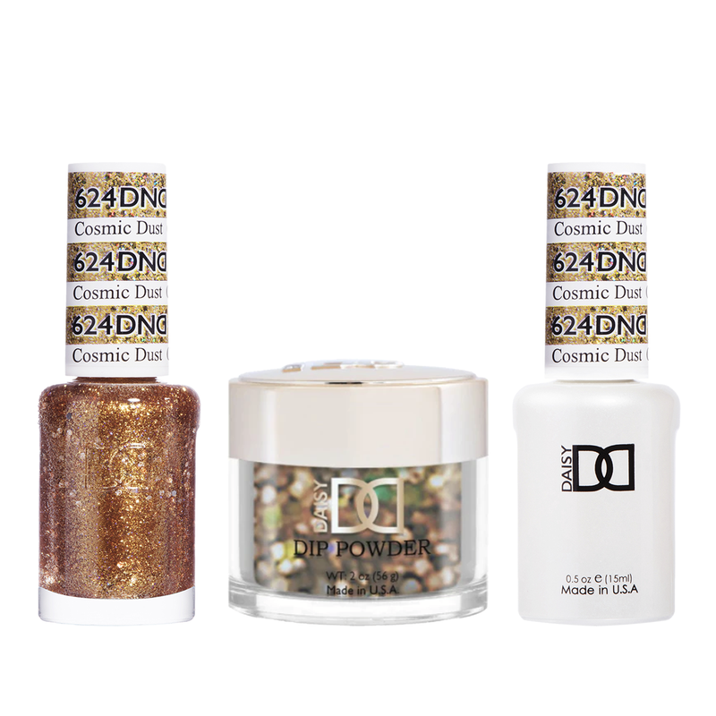 DND Trio - 624 Cosmic Dust includes a gel polish, a matching lacquer, and a dip powder. The set provides a complete solution for a professional manicure with a long-lasting and brown-gold glitter color.
