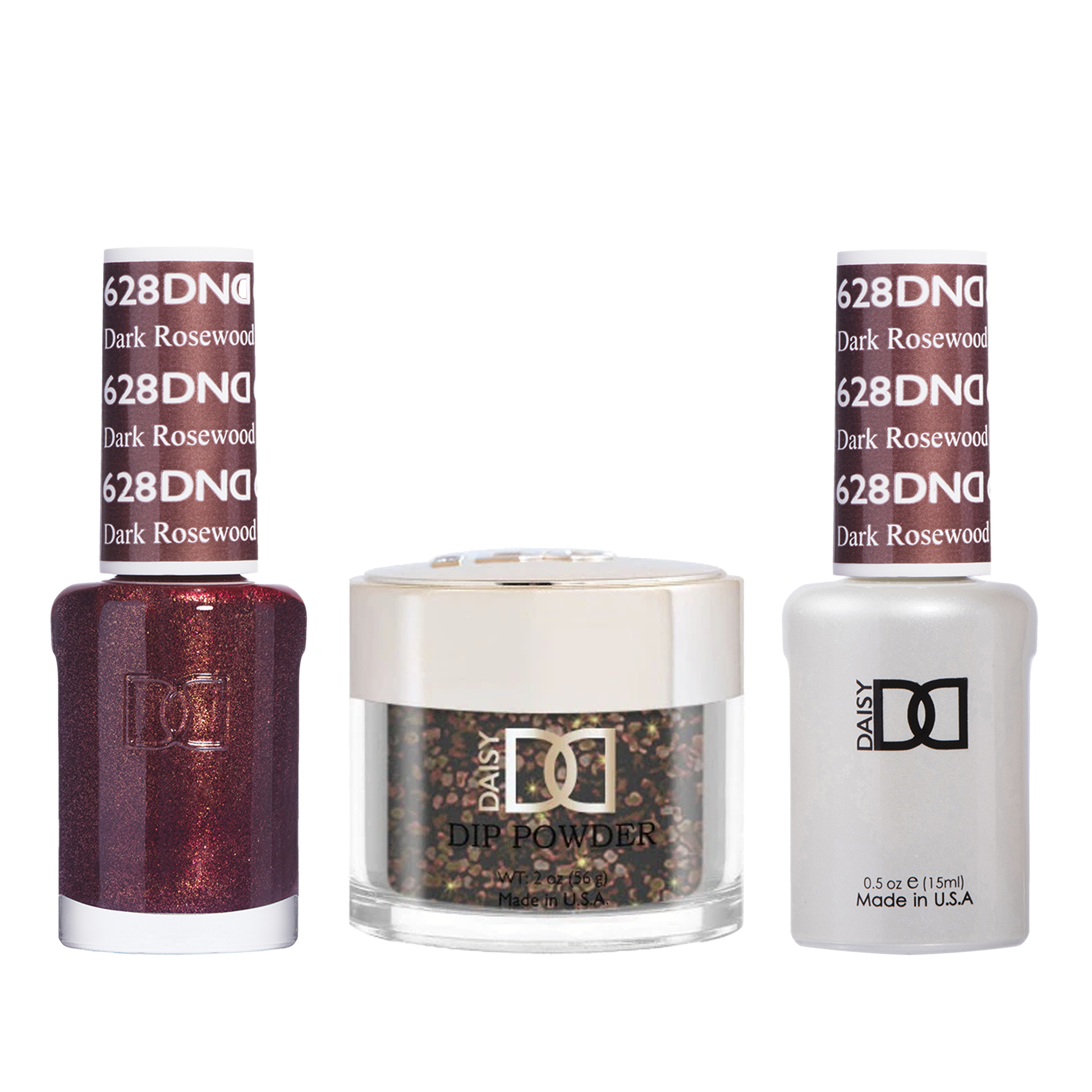 DND Trio - 628 Dark Rosewood includes a gel polish, a matching lacquer, and a dip powder. The set provides a complete solution for a professional manicure with a long-lasting and brown glitter color.