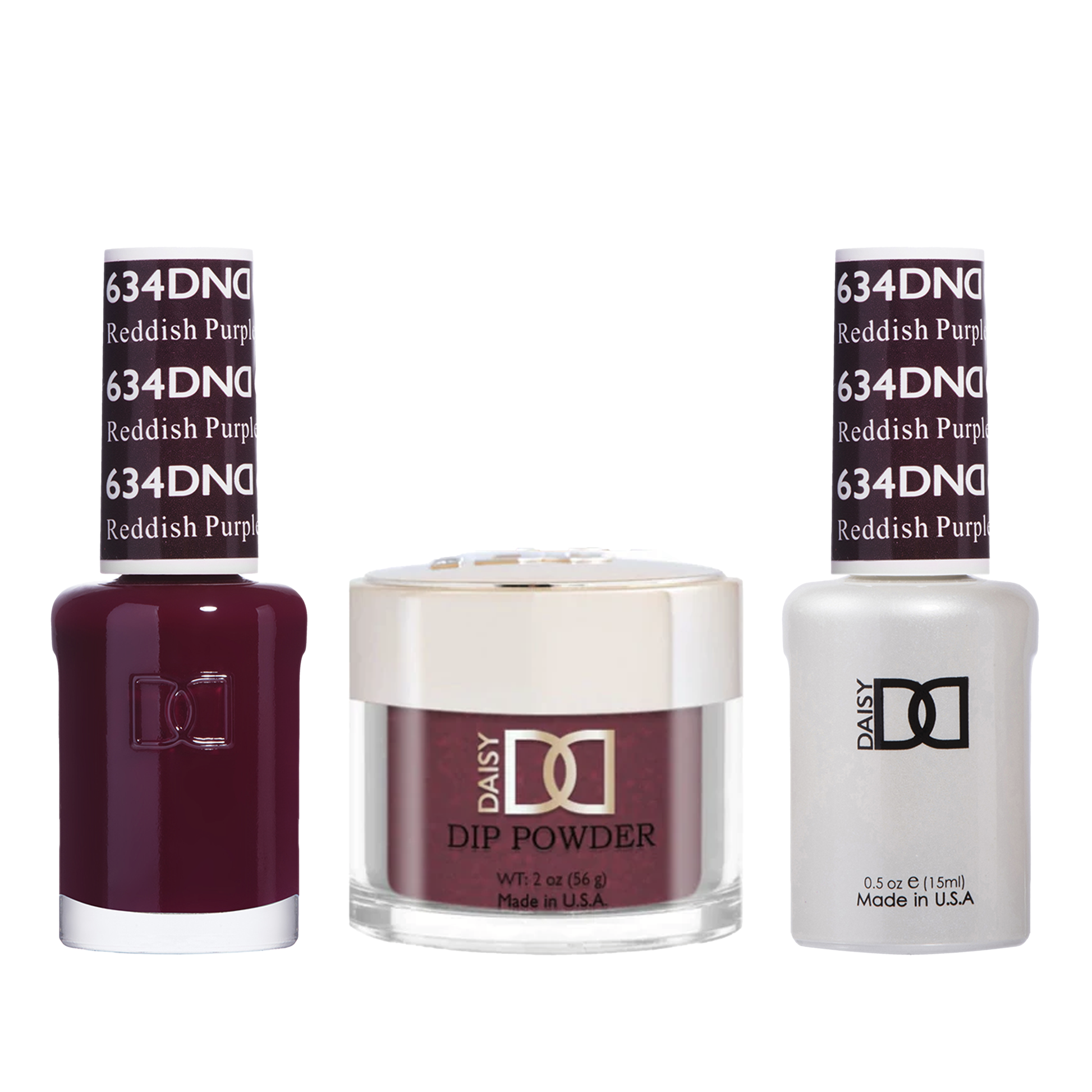 DND Trio - 634 Reddish Purple includes a gel polish, a matching lacquer, and a dip powder. The set provides a complete solution for a professional manicure with a long-lasting and red wine color.