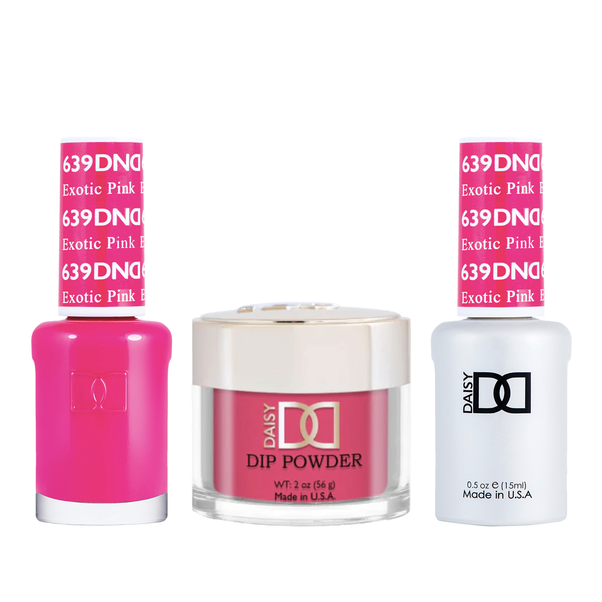 DND Trio - 639 Exotic Pink includes a gel polish, a matching lacquer, and a dip powder. The set provides a complete solution for a professional manicure with a long-lasting and red hot pink color.