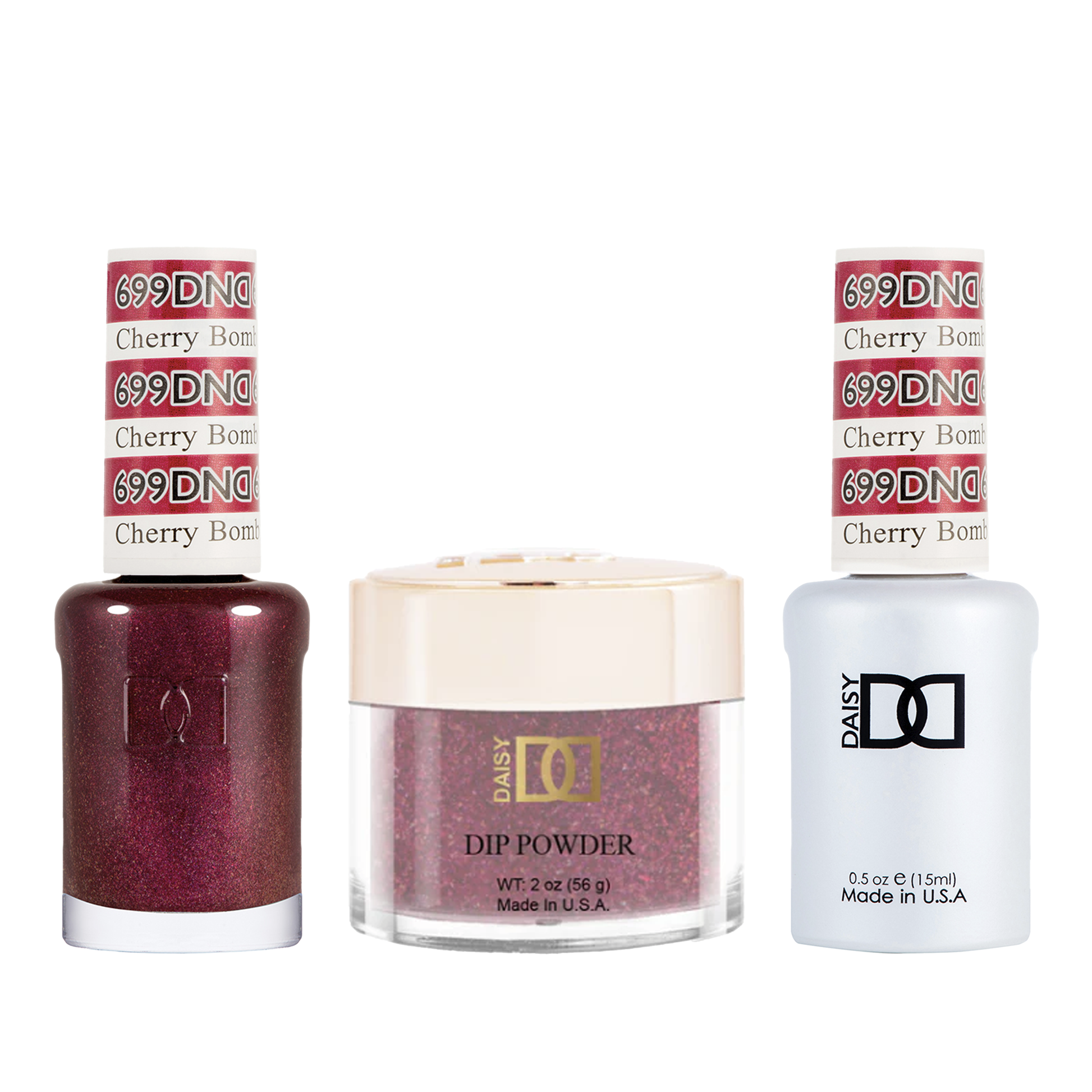 DND Trio - 699 Cherry Bomb includes a gel polish, a matching lacquer, and a dip powder. The set provides a complete solution for a professional manicure with a long-lasting and beautiful color.