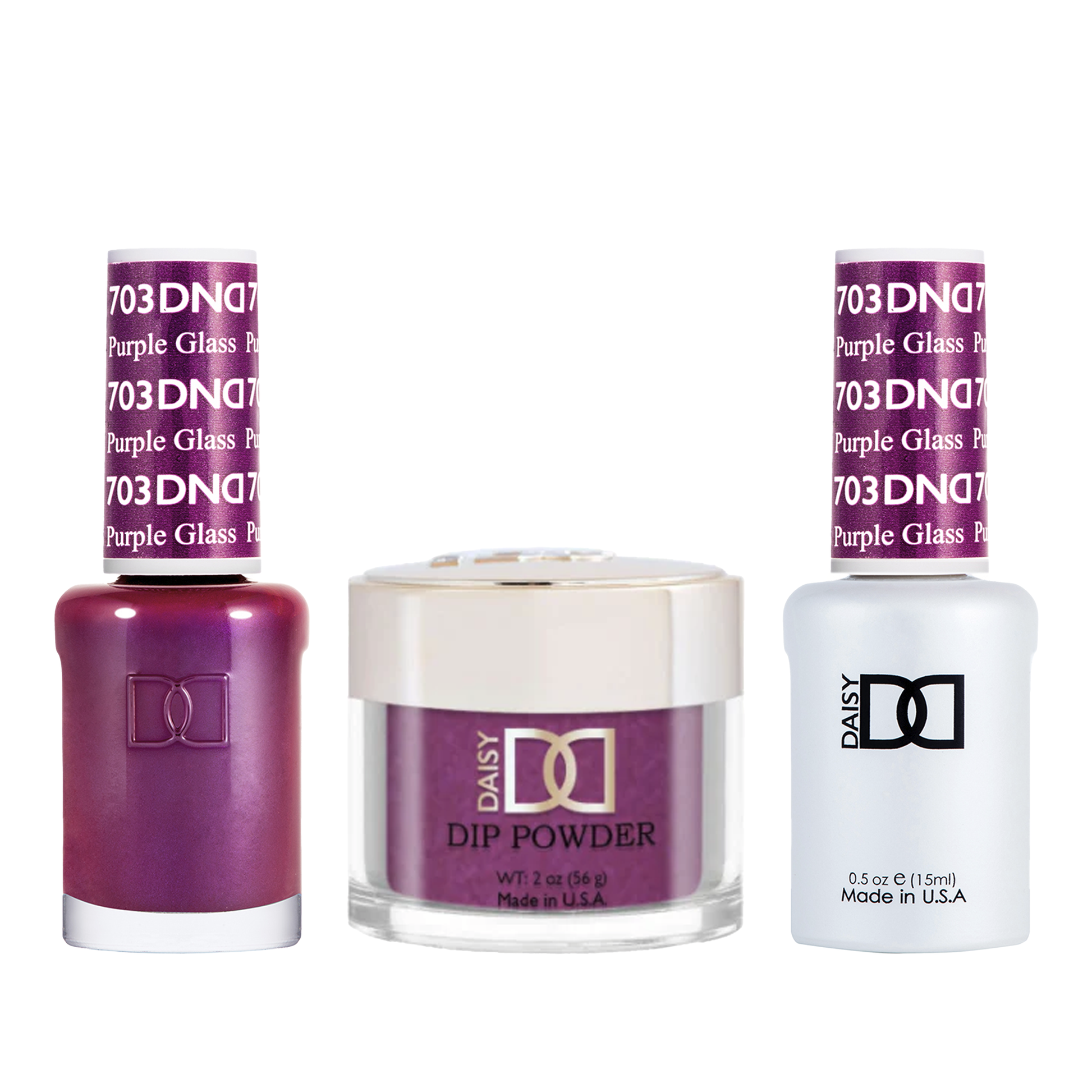 DND Trio - 703 Purple Glass includes a gel polish, a matching lacquer, and a dip powder. The set provides a complete solution for a professional manicure with a long-lasting and beautiful color.