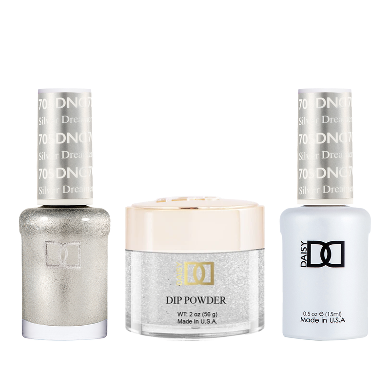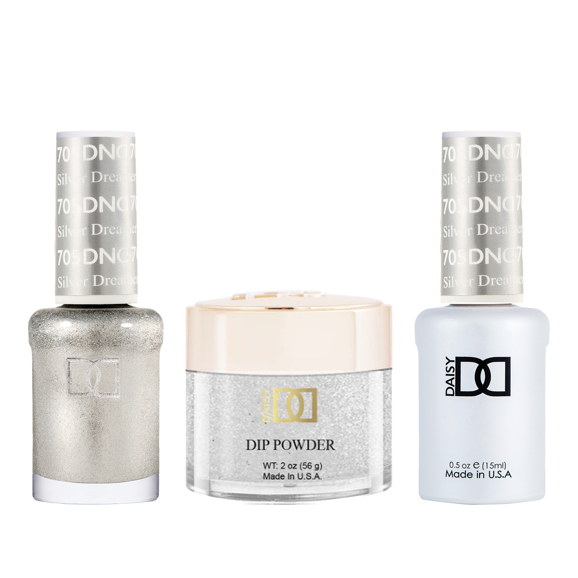 DND Trio - 705 Silver Dreamer includes a gel polish, a matching lacquer, and a dip powder. The set provides a complete solution for a professional manicure with a long-lasting and beautiful color.
