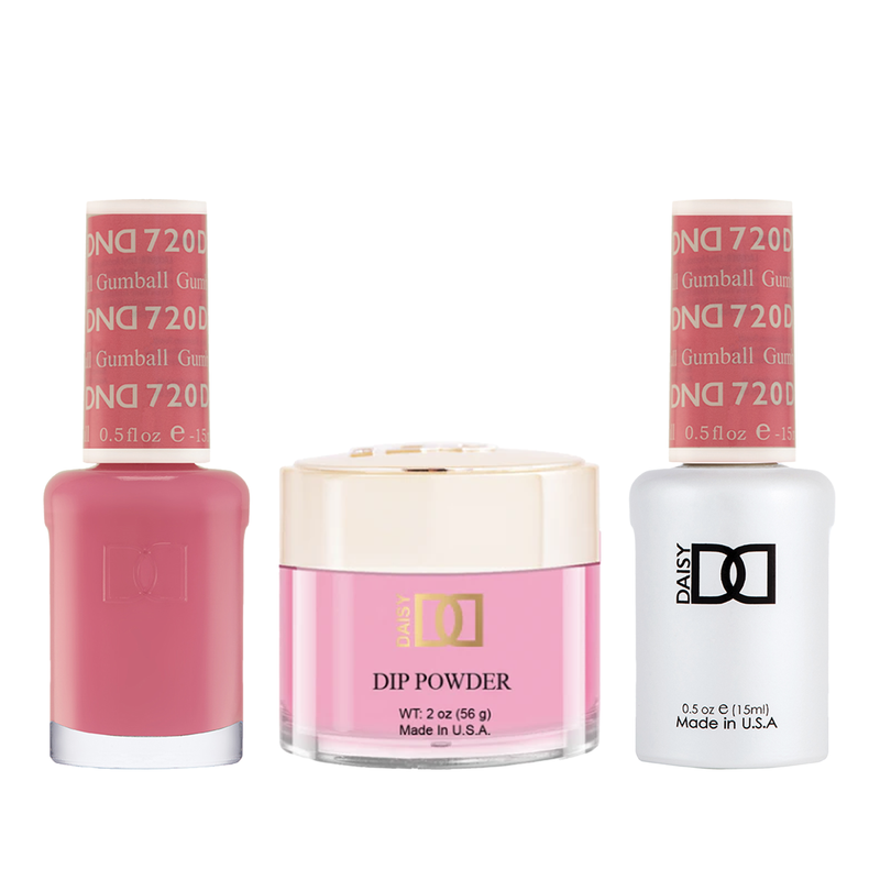 DND Trio - 720 Gumball includes a gel polish, a matching lacquer, and a dip powder. The set provides a complete solution for a professional manicure with a long-lasting and beautiful color.