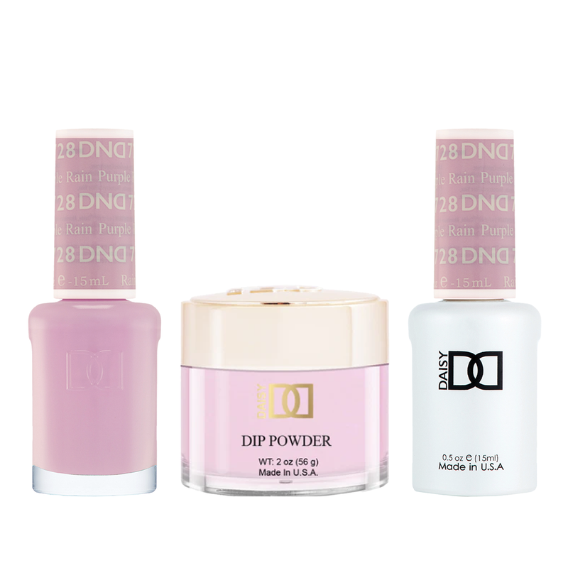 DND Trio - 728 Purple Rain includes a gel polish, a matching lacquer, and a dip powder. The set provides a complete solution for a professional manicure with a long-lasting and beautiful color.