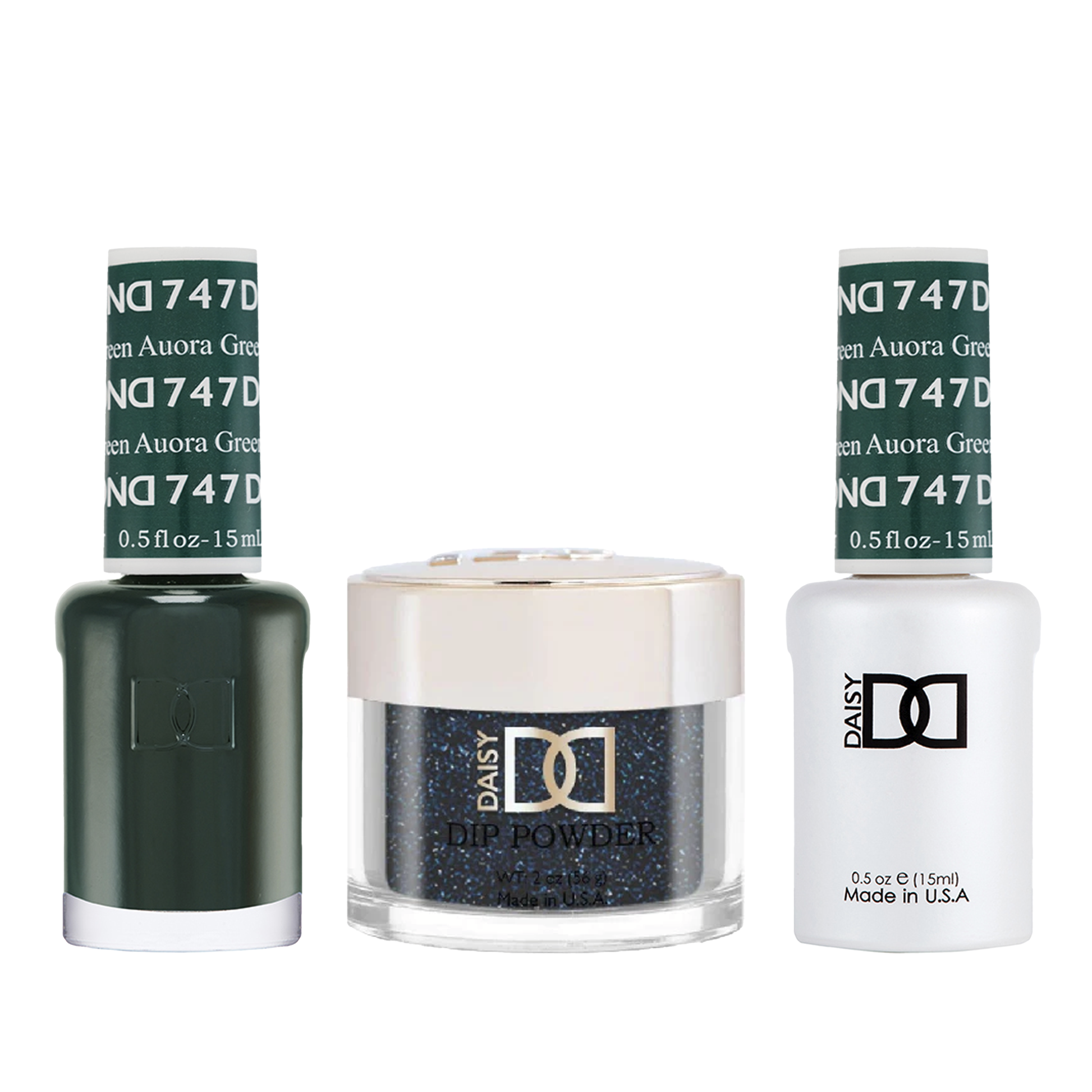 DND Trio - 747 Auora Green includes a gel polish, a matching lacquer, and a dip powder. The set provides a complete solution for a professional manicure with a long-lasting and beautiful color.