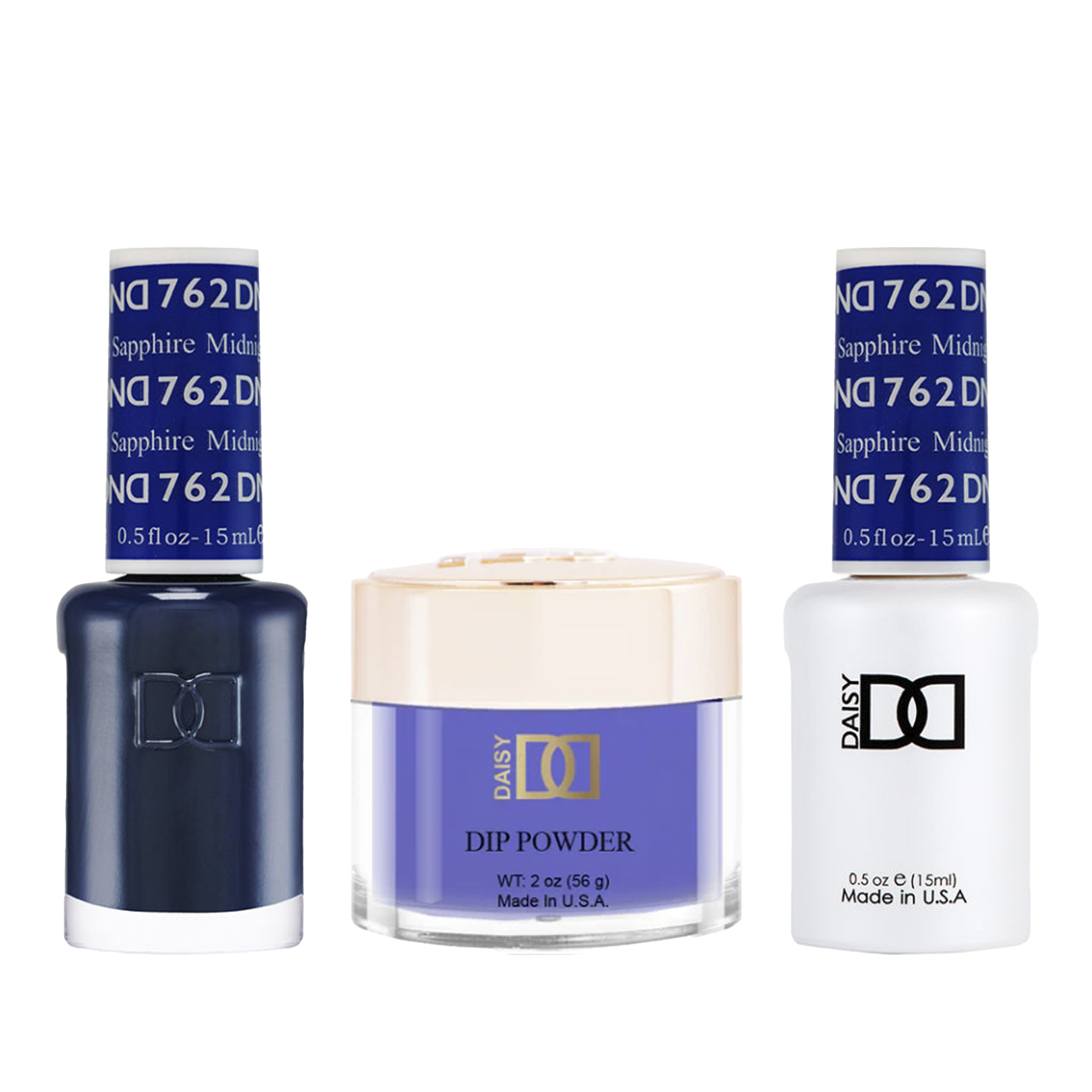 DND Trio - 762 Midnight Sapphire includes a gel polish, a matching lacquer, and a dip powder. The set provides a complete solution for a professional manicure with a long-lasting and beautiful color.