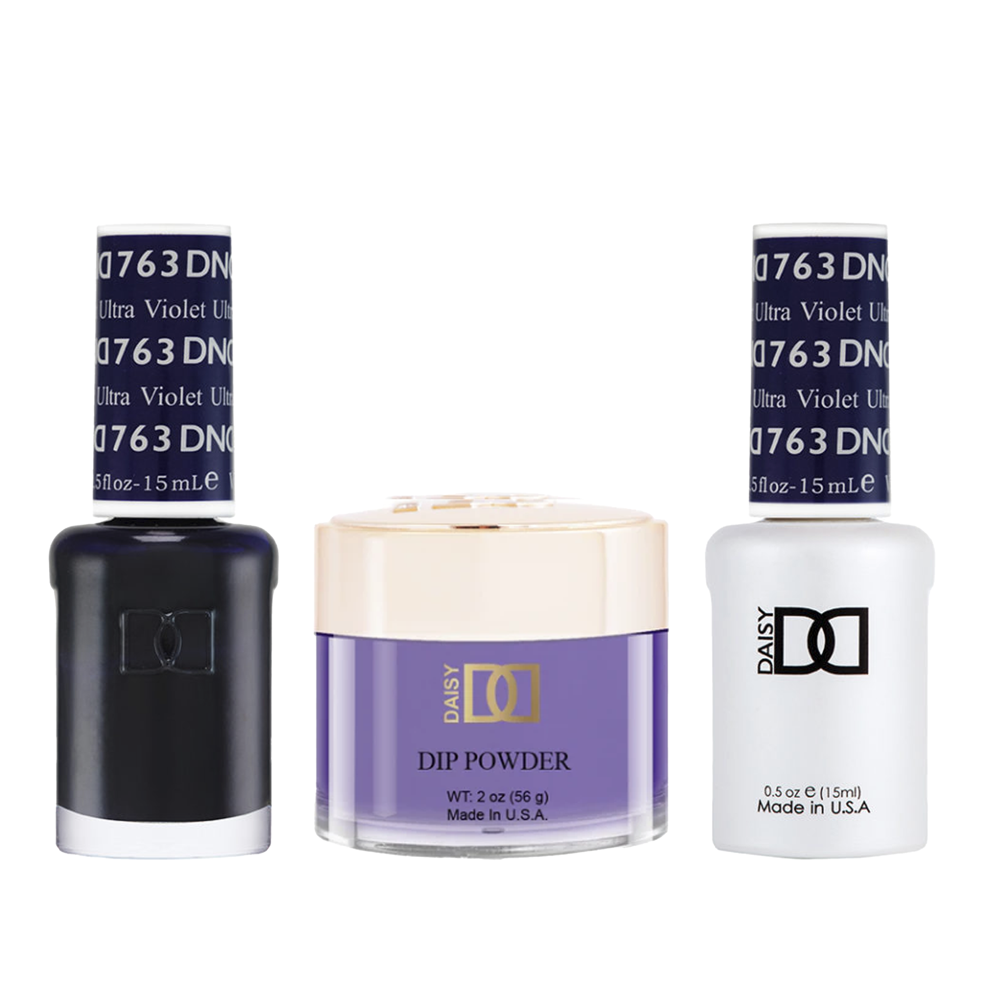 DND Dip 763 Ulta Violet includes a gel polish, a matching lacquer, and a dip powder. The set provides a complete solution for a professional manicure with a long-lasting and beautiful color.