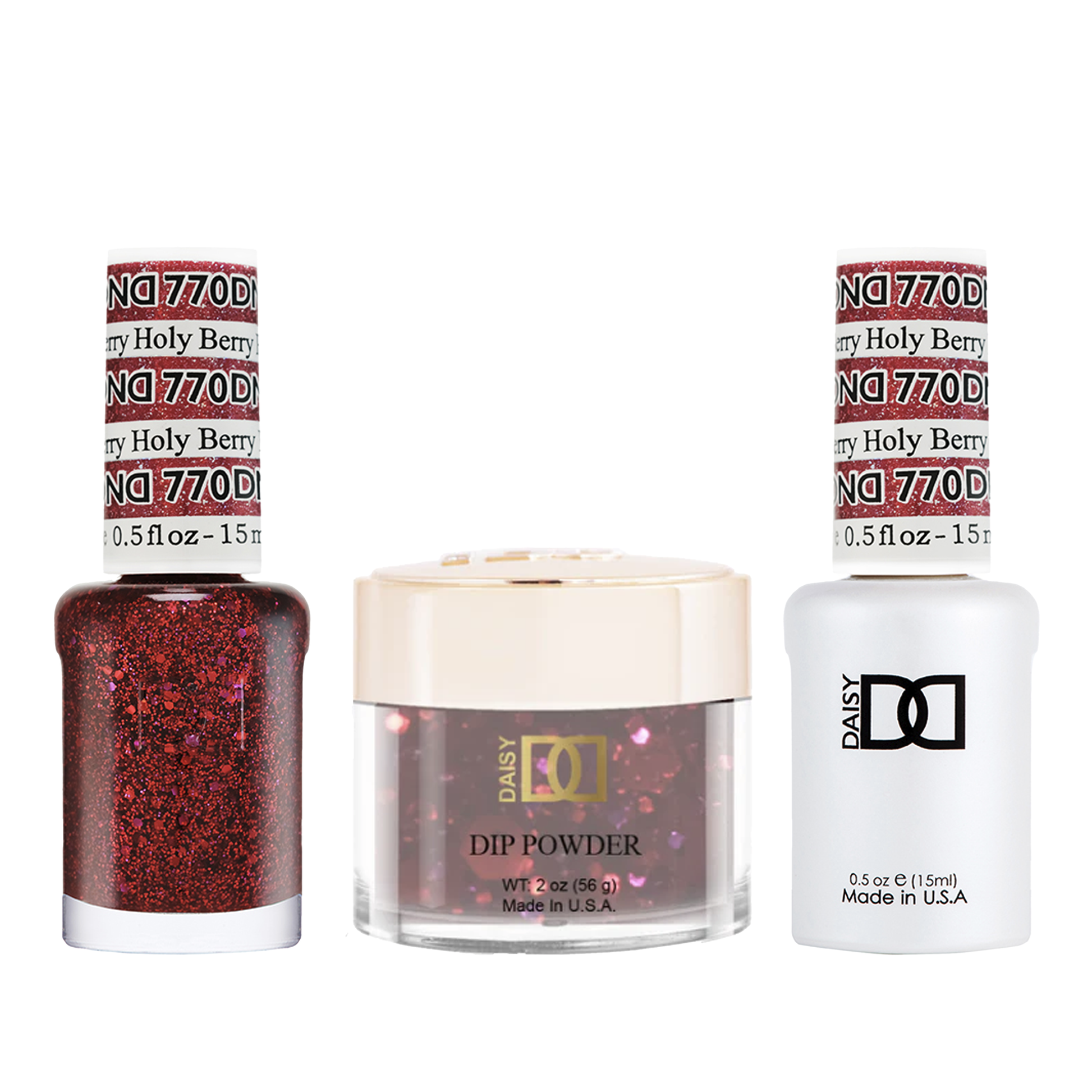 DND Trio - 770 Holy Berry includes a gel polish, a matching lacquer, and a dip powder. The set provides a complete solution for a professional manicure with a long-lasting and beautiful color.