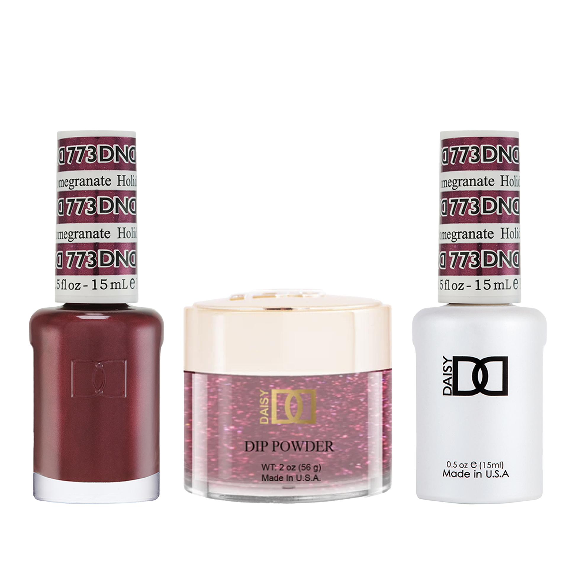 DND Trio - 773 Holiday Pomegrante includes a gel polish, a matching lacquer, and a dip powder. The set provides a complete solution for a professional manicure with a long-lasting and beautiful color.