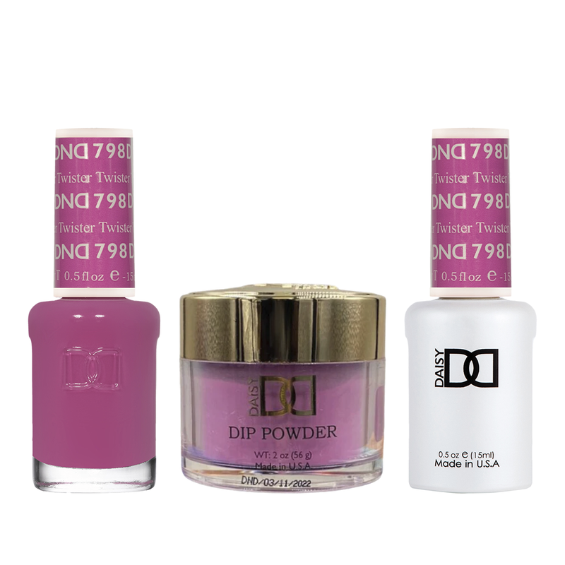DND Trio - 798 Twister includes a gel polish, a matching lacquer, and a dip powder. The set provides a complete solution for a professional manicure with a long-lasting and beautiful color.