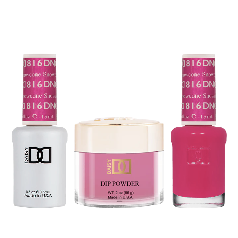 Enhance your nail game with the DND Trio in 816 Snowcone. This set includes a gel polish, nail polish, and dip powder, providing you with a complete and versatile nail care system. Achieve professional results at home with this convenient and high-quality set.
