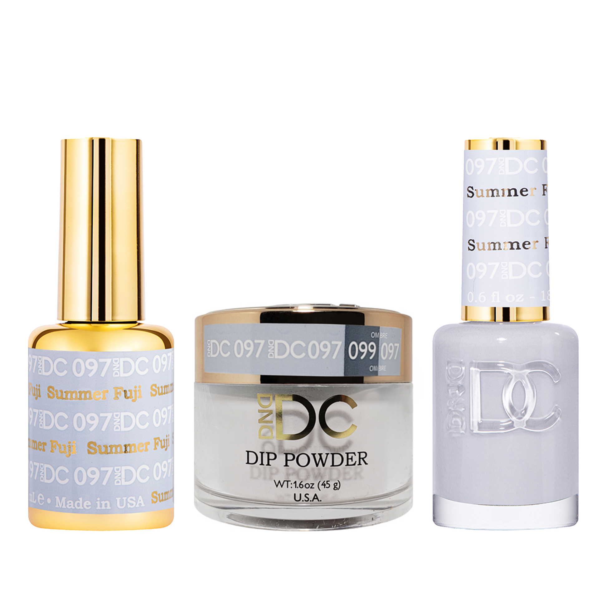 DND DC Trio 097 Summer Fuji includes a gel polish, a matching lacquer and powder. The set provides a complete solution for a professional manicure with a long-lasting and beautiful color.