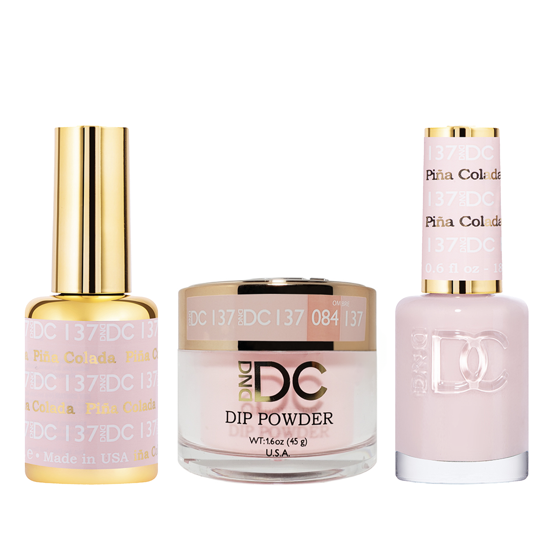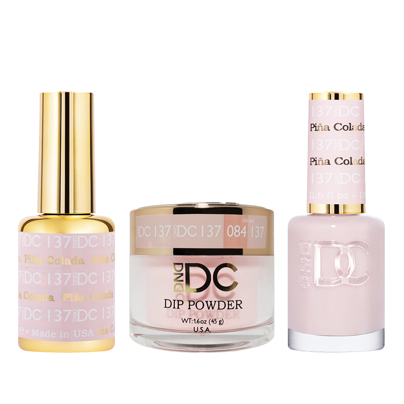 DND DC Trio 137 Pina Colada includes a gel polish, a matching lacquer and powder. The set provides a complete solution for a professional manicure with a long-lasting and beautiful color.