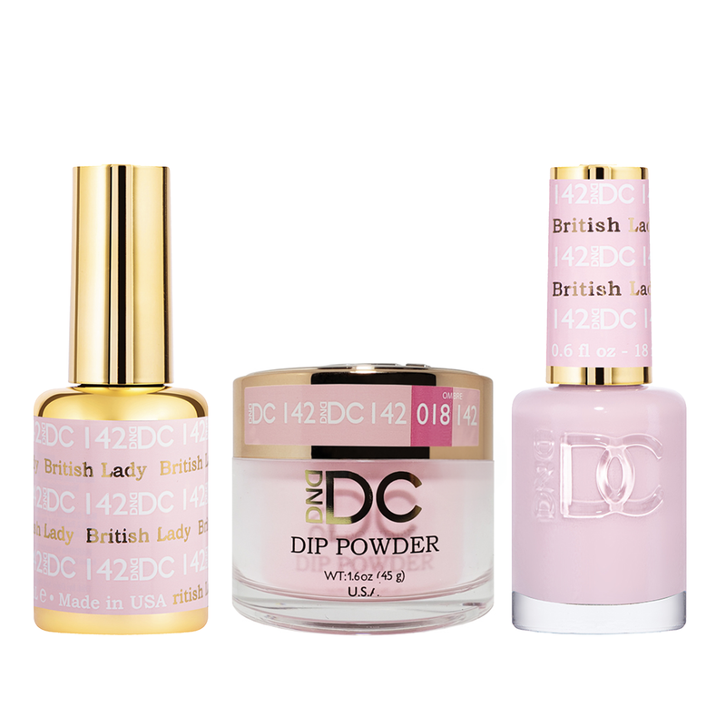 DND DC Trio 142 British Lady includes a gel polish, a matching lacquer and powder. The set provides a complete solution for a professional manicure with a long-lasting and beautiful color.