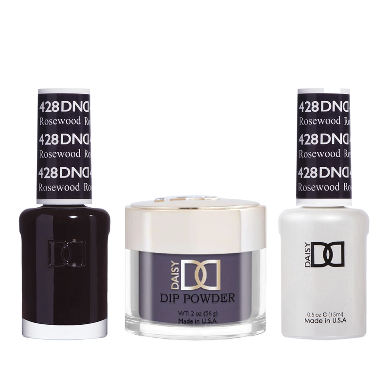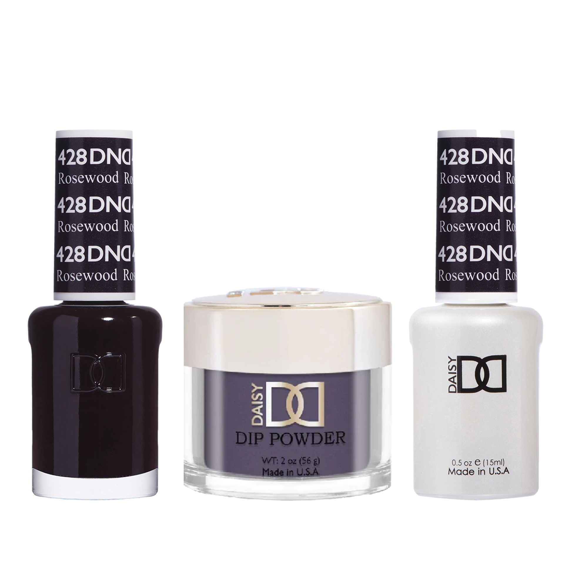 DND Trio - 428 Rosewood is a dark purple nail polish set that includes a gel, dip, and lacquer. This shade is perfect for creating bold and sophisticated nail looks. The deep, rich color is sure to turn heads and make a statement.