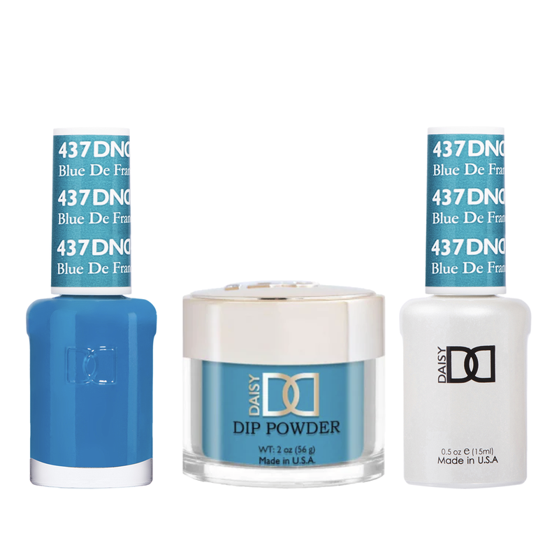 DND Trio - 437 Blue De France is a set that includes gel, dip and lacquer in a rich shade of blue. This shade will add a pop of color to your nails, perfect for any special occasion or just for everyday wear. The lacquer finish has a smooth and glossy texture, perfect for creating long-lasting manicures.
