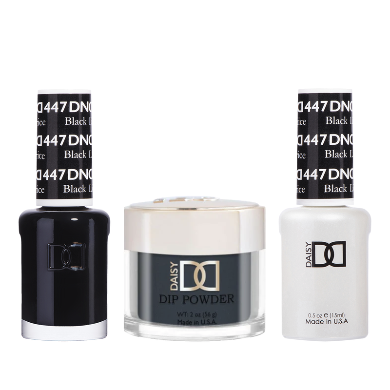 DND Trio - 447 Black Licorice is a professional-grade nail lacquer, dip powder, and gel polish set in a deep, intense black color. This sleek and sophisticated shade is perfect for making a bold statement or creating an edgy, fashion-forward look.