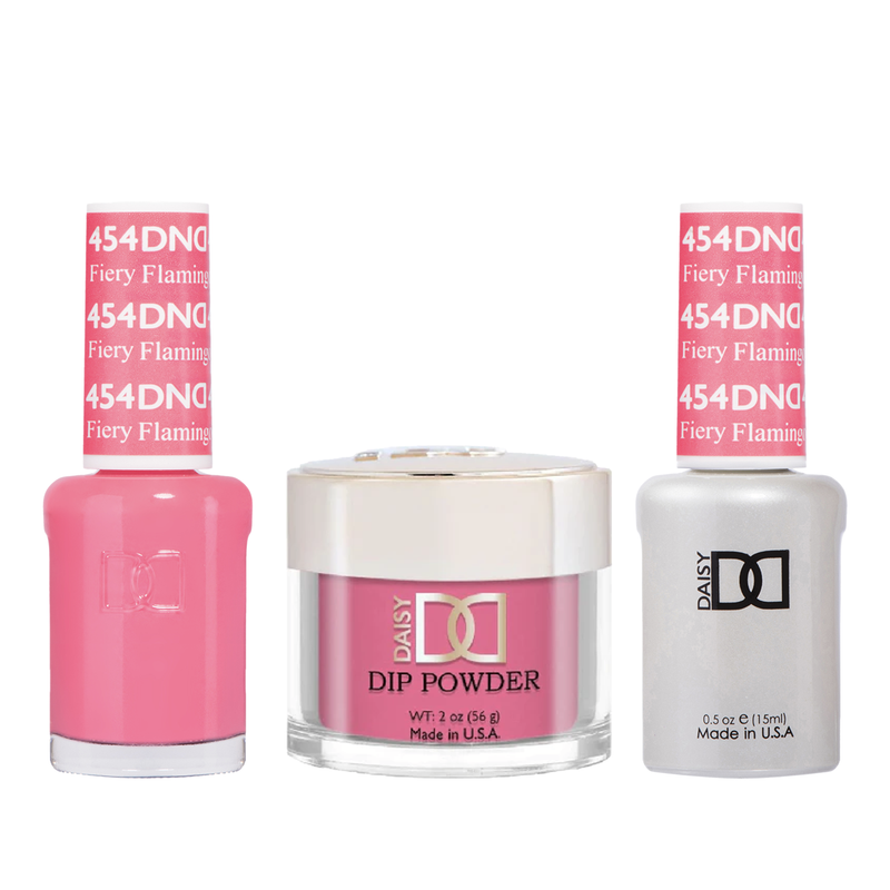 DND Trio - 454 Fiery Flamingo is a set of professional-grade nail lacquer, dip powder, and gel polish in a vibrant hot pink shade. Perfect for adding a pop of color to your look, this set provides long-lasting, chip-resistant, and glossy color for up to two weeks.