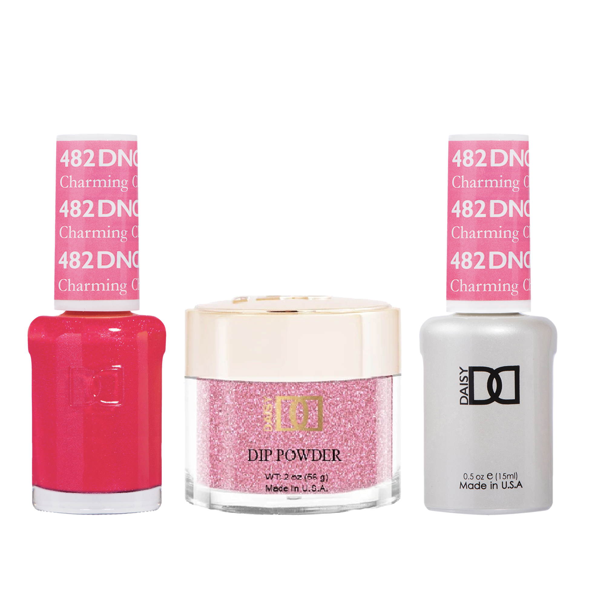 DND Trio - 482 Charming Cherry is a professional-grade nail lacquer, dip powder, and gel polish set in a charming shade of pink. This playful color adds a pop of fun to any look. The set includes three formulas that work together to provide long-lasting, glossy color that is chip-resistant and easy to apply.