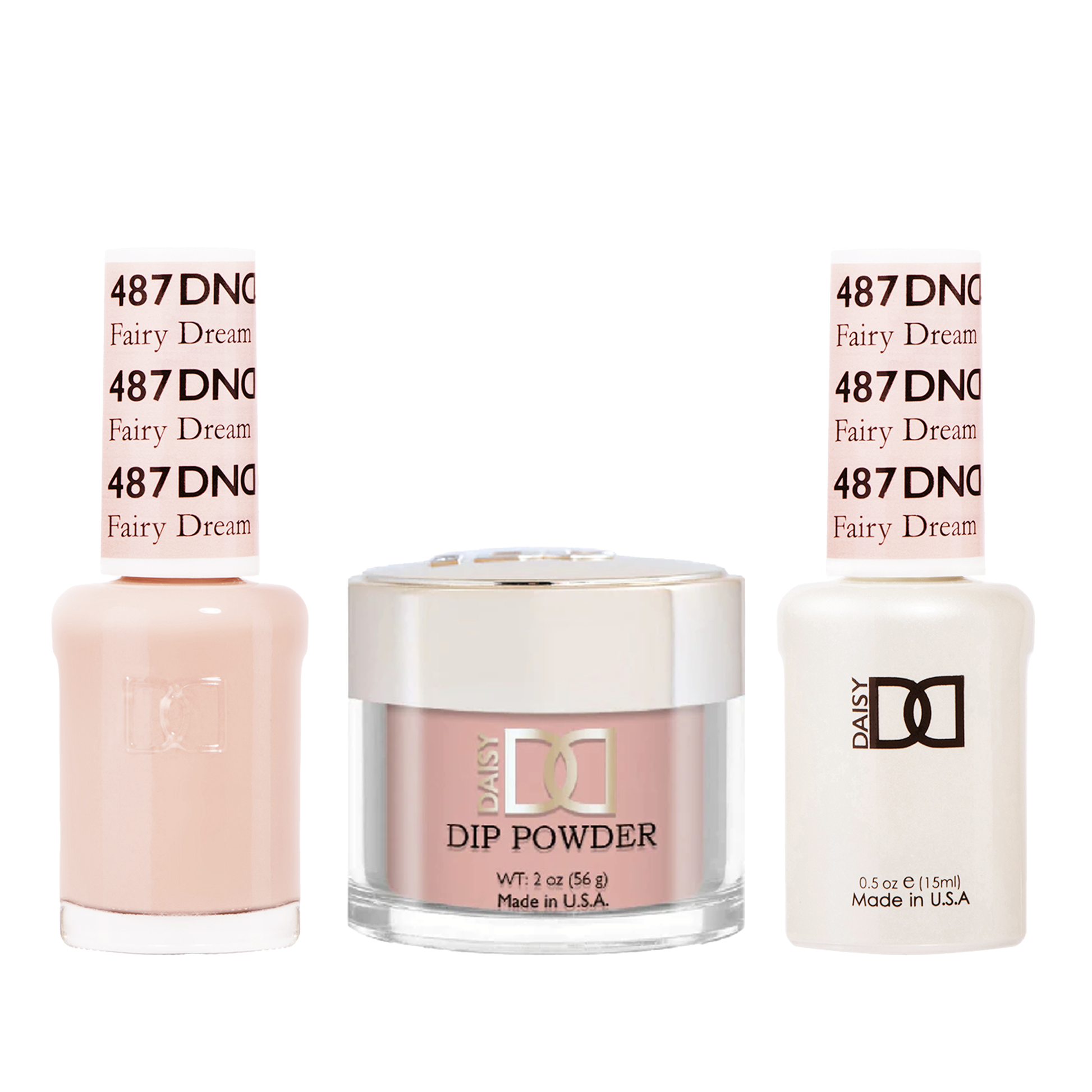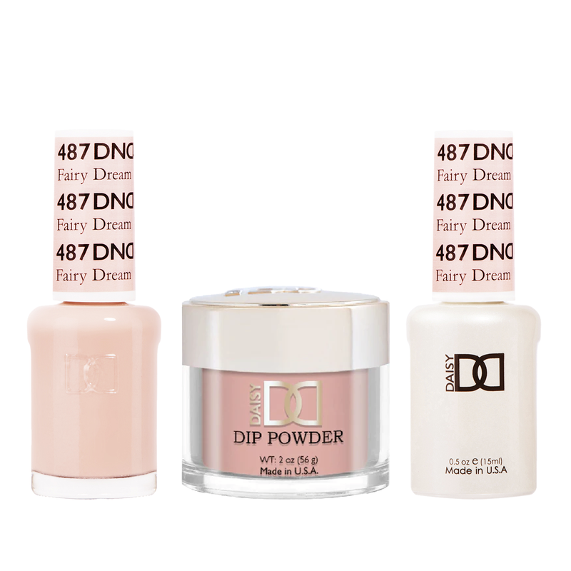 DND Trio - 487 Fairy Dream is a set of three professional-grade nail lacquer, dip powder, and gel polish in a delicate shade of pink with a touch of glitter. This dreamy color is perfect for adding a touch of glamour to your look.