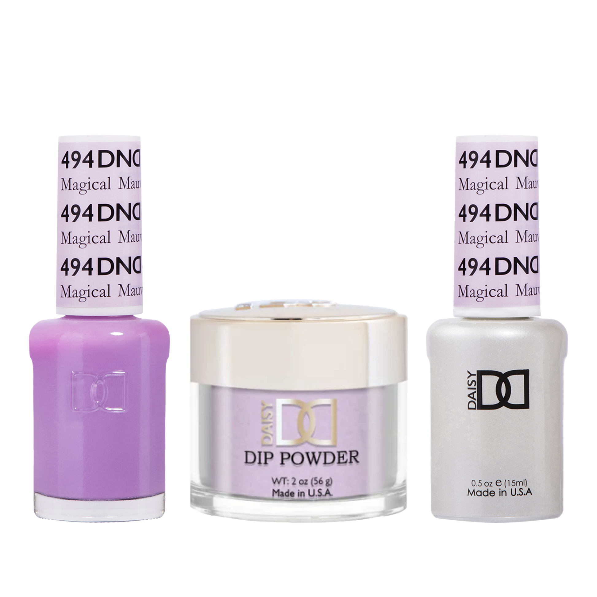 he DND Trio in shade 494 Magical Mauve includes a gel polish, a matching lacquer, and a dip powder. The set provides a complete solution for a professional manicure with a long-lasting and vibrant mauve color. The gel and lacquer work together to create a smooth and glossy finish, while the dip powder adds strength and durability to the manicure.