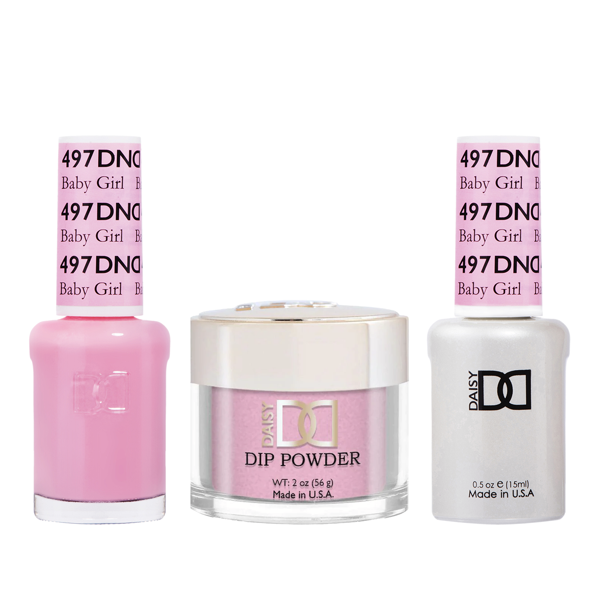 The DND Trio in shade 497 Baby Girl includes a gel polish, a matching lacquer, and a dip powder. The set provides a complete solution for a professional manicure with a long-lasting and soft baby pink color. The gel and lacquer work together for a glossy finish, while the dip powder adds strength and durability to the manicure. This trio is a great option for those seeking a soft and feminine baby pink manicure.