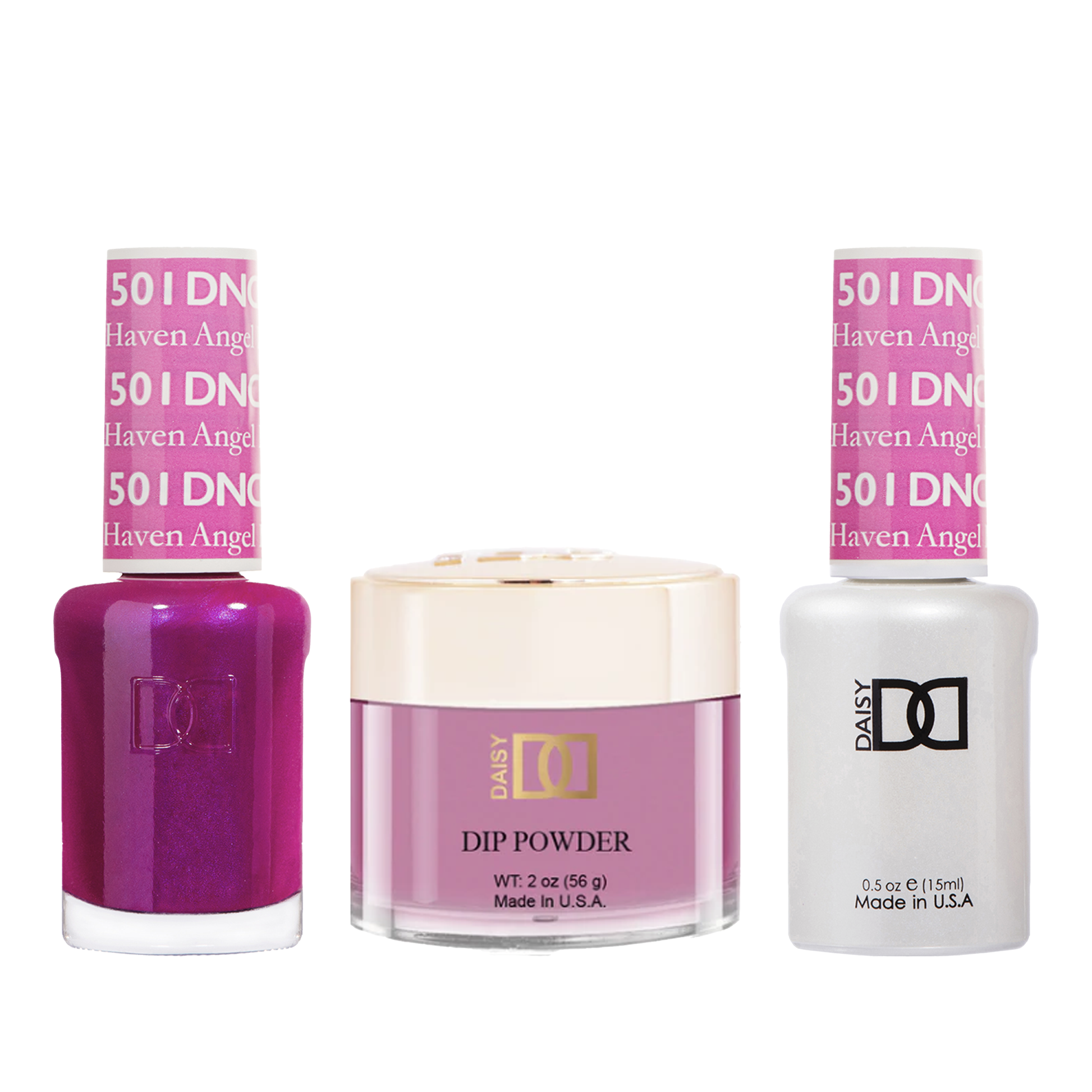 DND Trio - 501 Haven Angel includes a gel polish, a matching lacquer, and a dip powder. The set provides a complete solution for a professional manicure with a long-lasting and pink color.