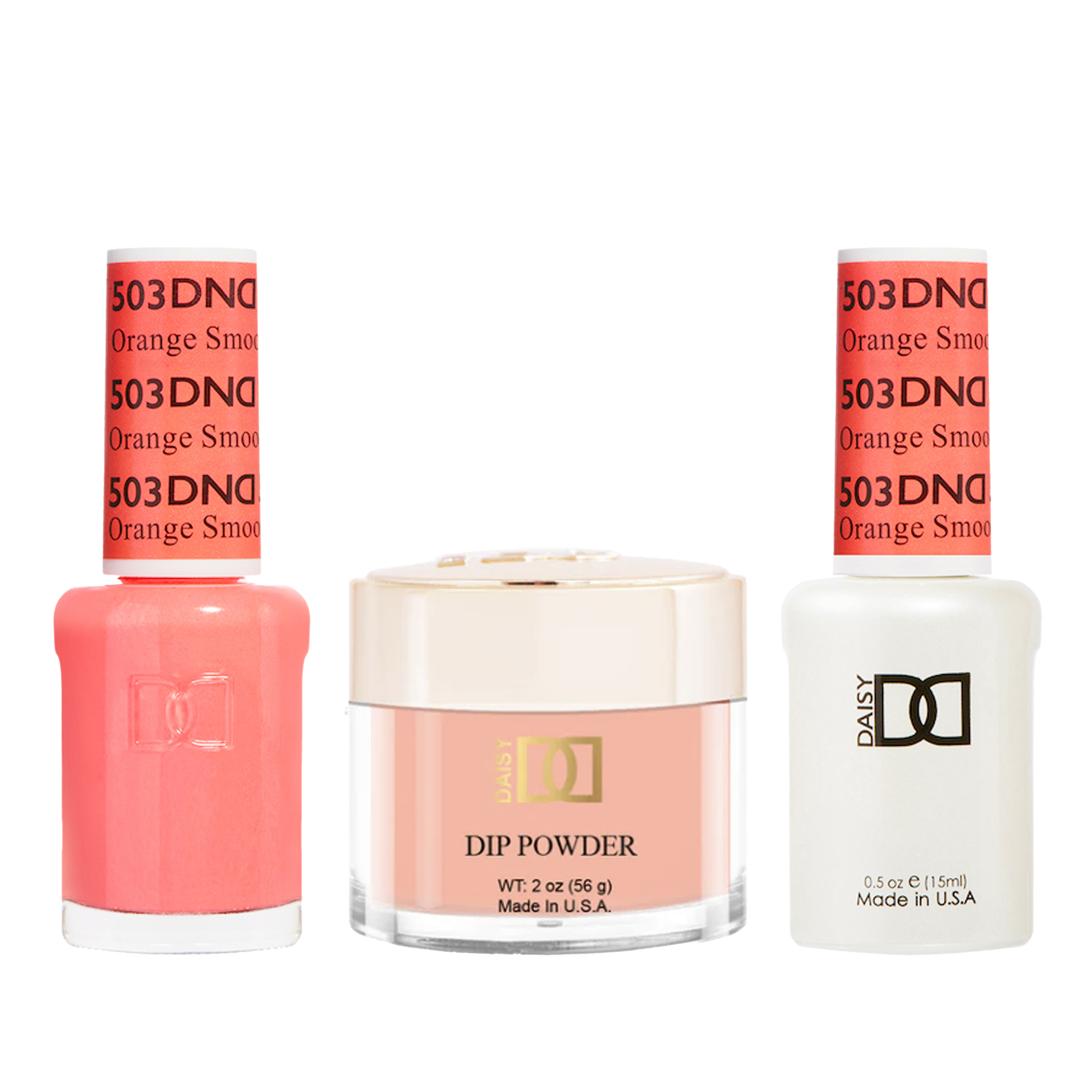 DND Trio - 503 Orange Smoothie includes a gel polish, a matching lacquer, and a dip powder. The set provides a complete solution for a professional manicure with a long-lasting and beautiful orange color.