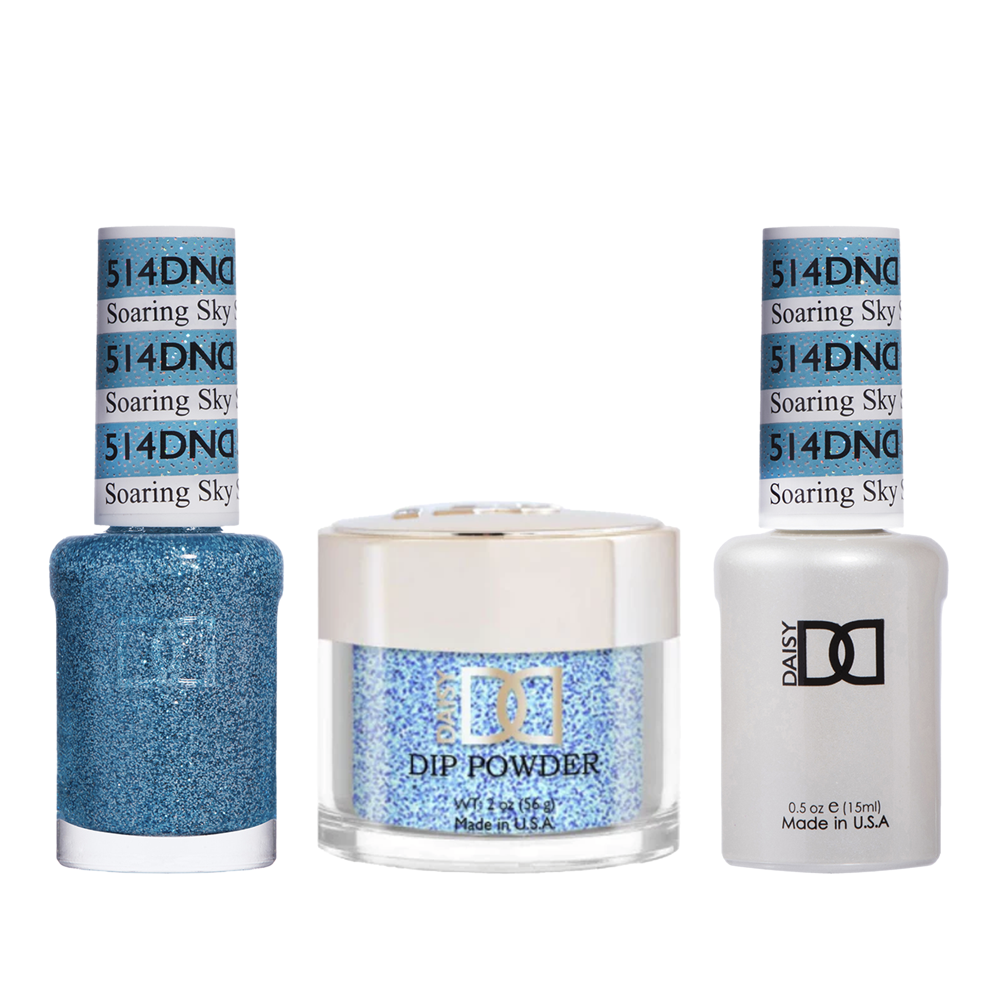 DND Trio - 514 Soaring Sky includes a gel polish, a matching lacquer, and a dip powder. The set provides a complete solution for a professional manicure with a long-lasting and shimmering sky blue color.