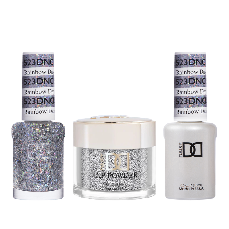 DND Trio - 523 Rainbow Day includes a gel polish, a matching lacquer, and a dip powder. The set provides a complete solution for a professional manicure with a long-lasting and shimmering silver color.