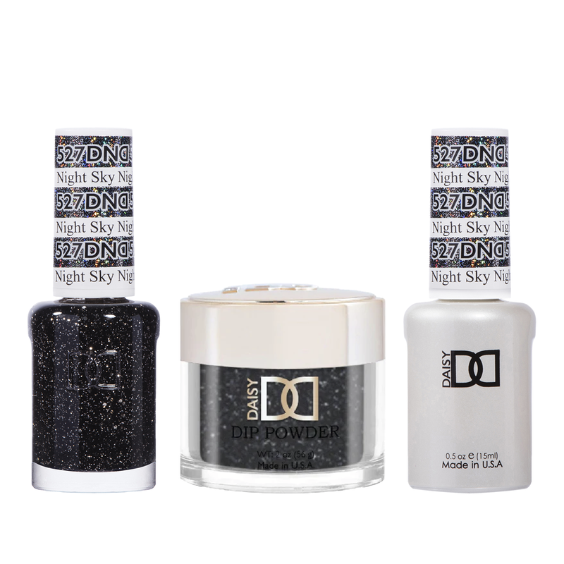 DND Trio - 527 Night Sky includes a gel polish, a matching lacquer, and a dip powder. The set provides a complete solution for a professional manicure with a long-lasting and shimmering black color.