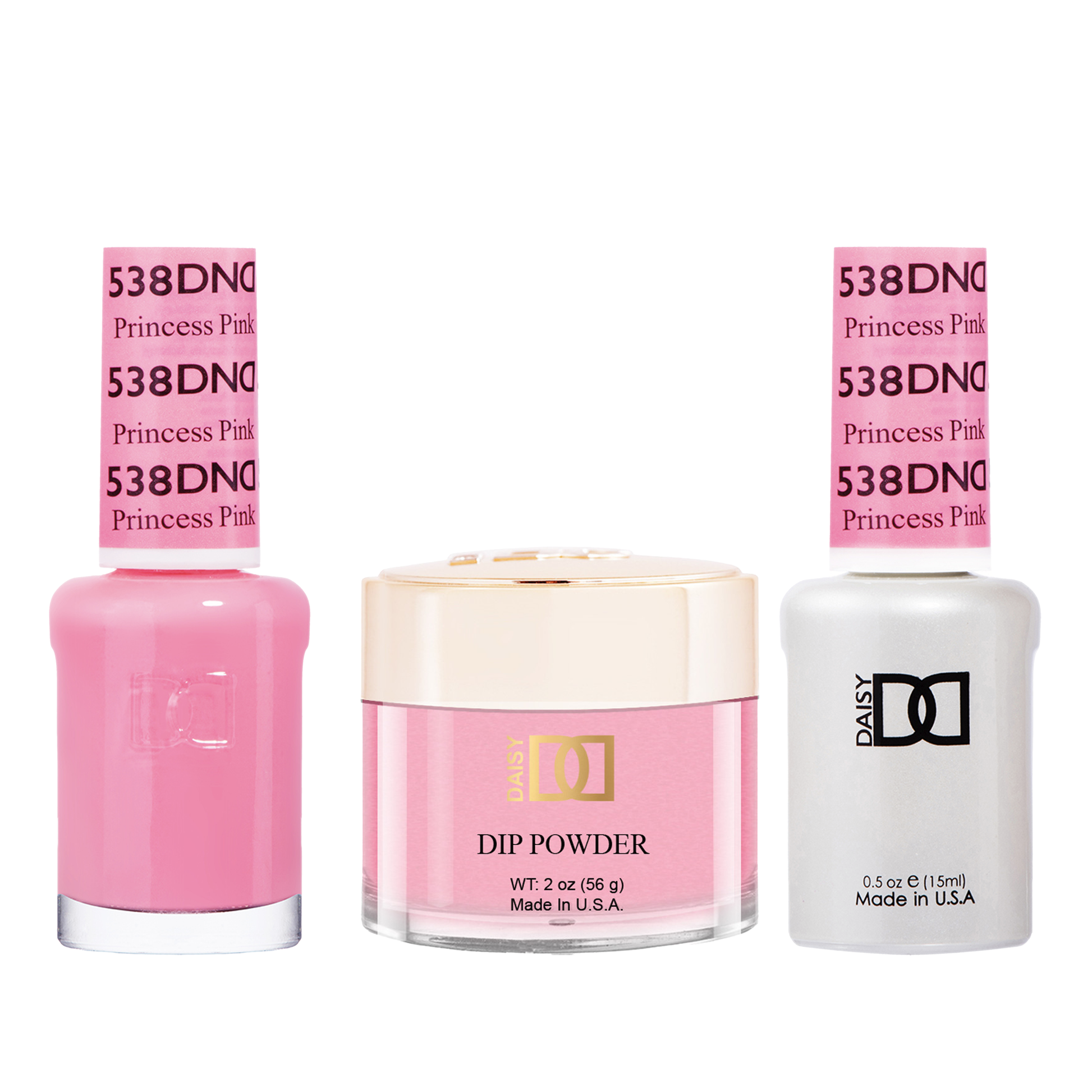 DND Trio - 538 Princess Pink includes a gel polish, a matching lacquer, and a dip powder. The set provides a complete solution for a professional manicure with a long-lasting and shimmering pink color.