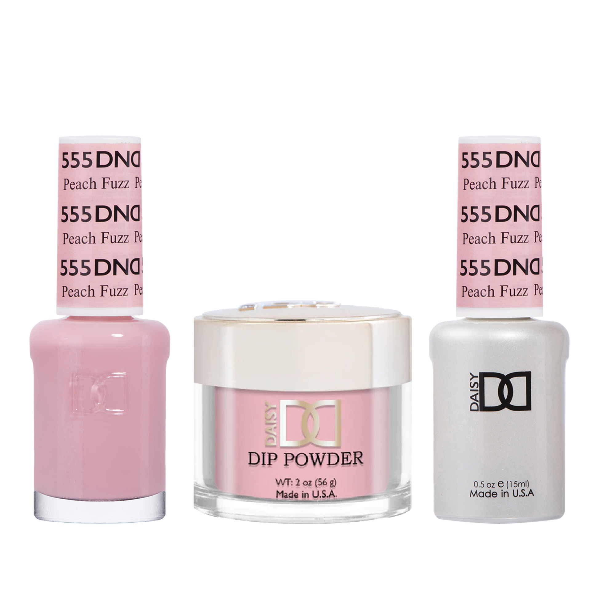 DND Trio - 555 Peach Fuzz includes a gel polish, a matching lacquer, and a dip powder. The set provides a comprehensive solution for a professional manicure with a long-lasting and delicate blushing pink color. The gel and lacquer work together for a glossy finish, while the dip powder adds strength and durability to the manicure.