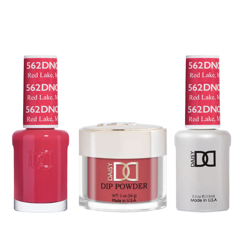 DND Trio - 562 Red Lake includes a gel polish, a matching lacquer, and a dip powder. The set provides a comprehensive solution for a professional manicure with a long-lasting and delicate red color. The gel and lacquer work together for a glossy finish, while the dip powder adds strength and durability to the manicure.