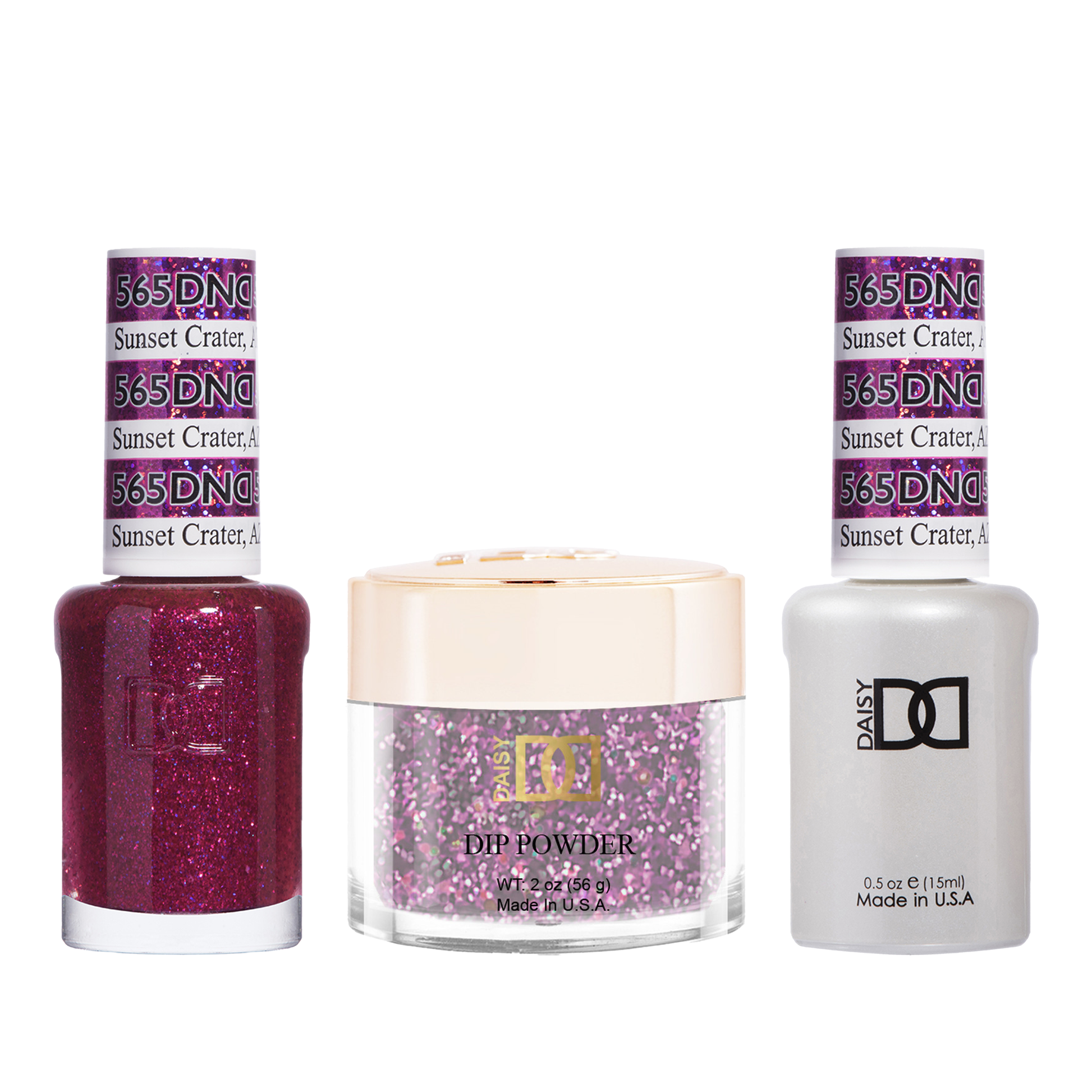 DND Trio - 565 Sunset Crater, Az includes a gel polish, a matching lacquer, and a dip powder. The set provides a comprehensive solution for a professional manicure with a long-lasting and delicate glittering pink color. The gel and lacquer work together for a glossy finish, while the dip powder adds strength and durability to the manicure.