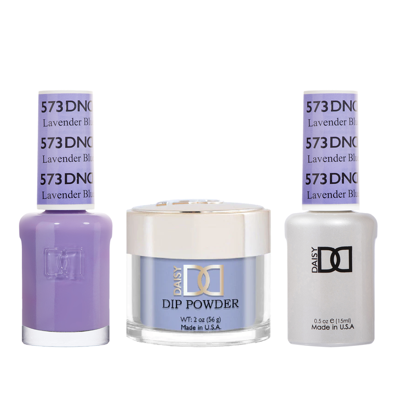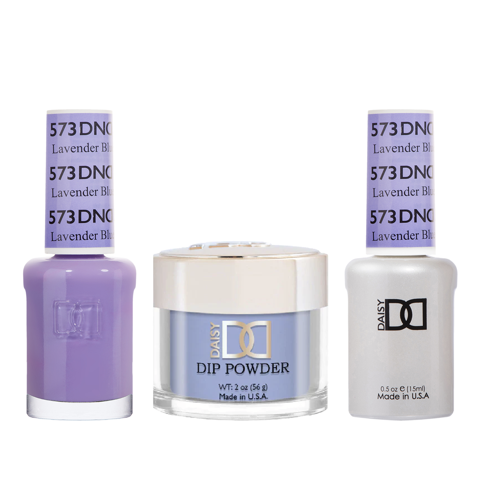 DND Trio - 573 Lavender Blue includes a gel polish, a matching lacquer, and a dip powder. The set provides a comprehensive solution for a professional manicure with a long-lasting and delicate purple color. The gel and lacquer work together for a glossy finish, while the dip powder adds strength and durability to the manicure.